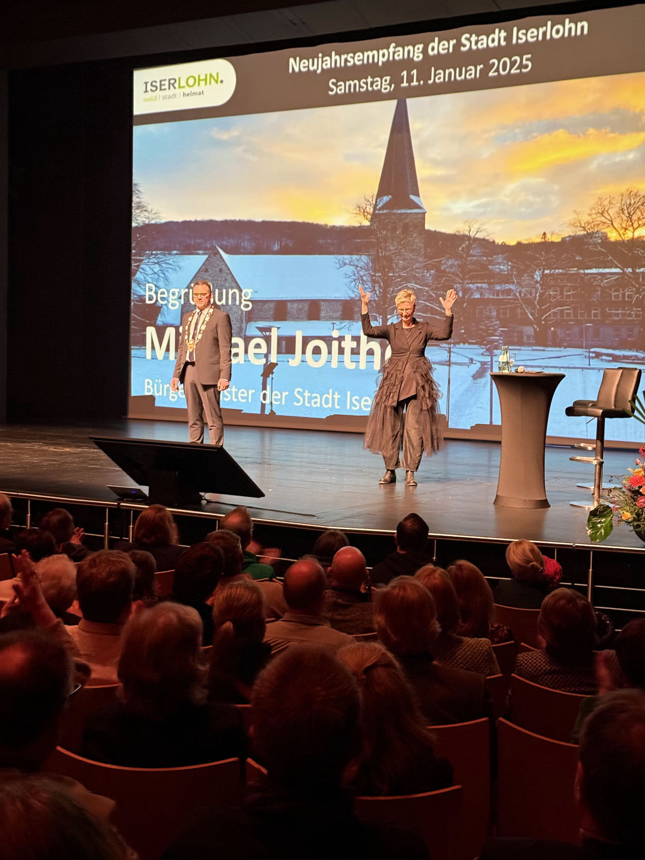 Bürgermeister Michael Joithe und Gebärdensprach-Dolmetscherin Stephanie Prothmann bei der Neujahrsansprache.