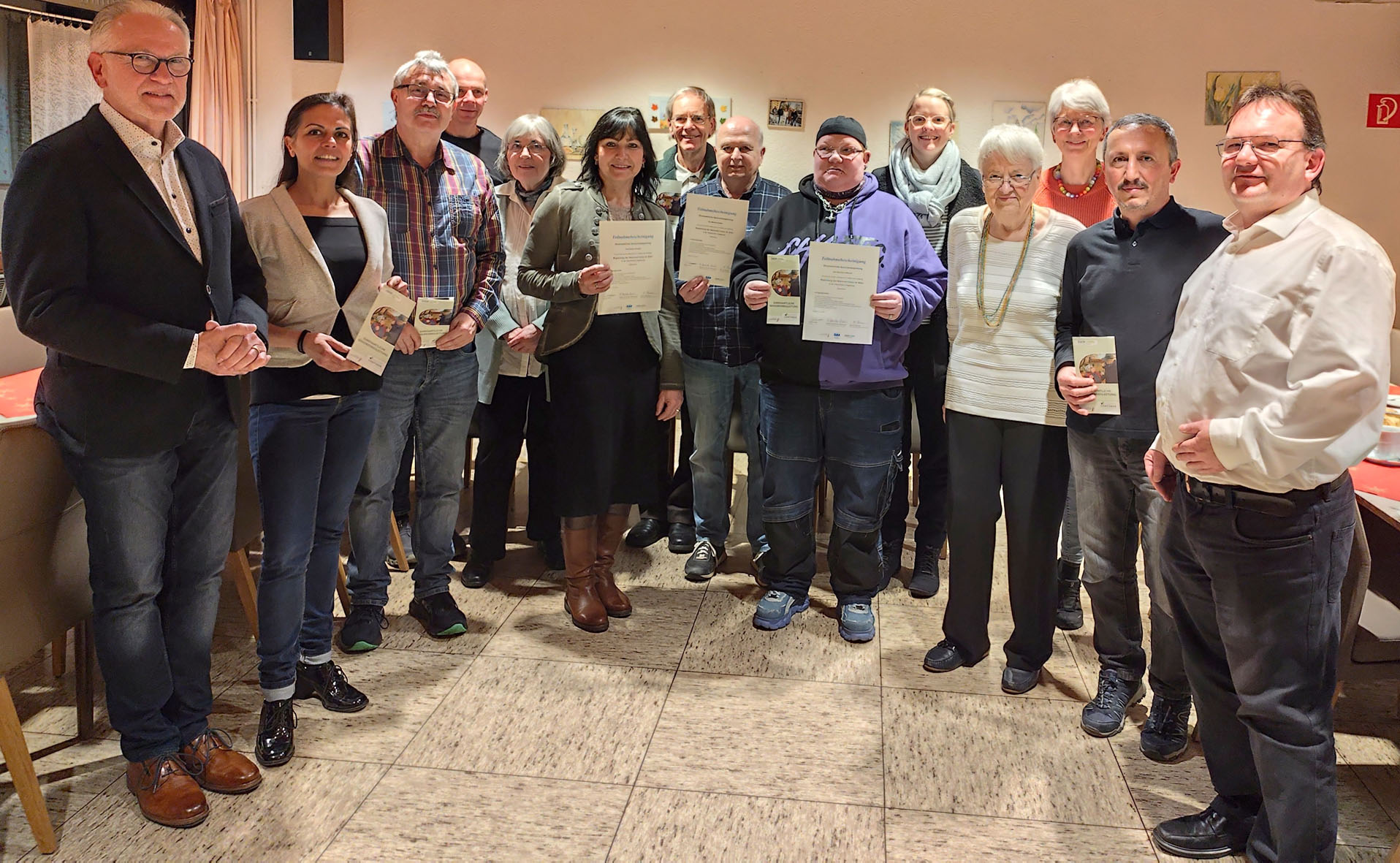 Die Bereichsleiterin Soziales der Stadt Iserlohn Burcu Öcaldi (2.v.l.) übergab im Kreis von „Continue“ die Zertifikate an die frisch ausgebildeten Seniorenbegleiterinnen und -begleiter. Projektkoordinator Heinz Theo Beermann (l.) und Hinrich Riemann von der Servicestelle Ehrenamt (r.) vermitteln die ehrenamtlichen Kräfte gern an interessierte Hilfesuchende.