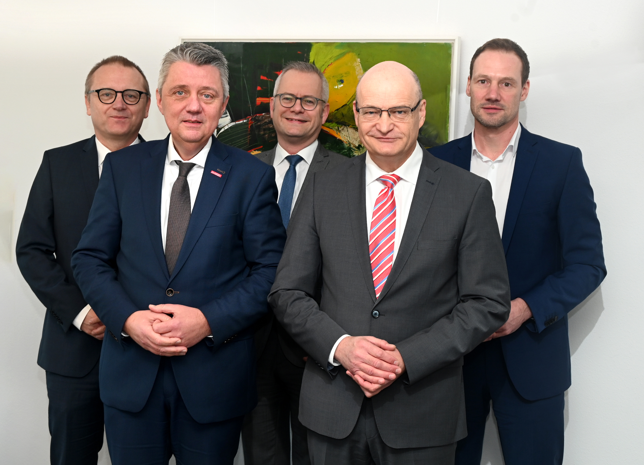 Landrat Dr. Martin Sommer (2. v. r) begrüßte Jürgen Kroos (2. v. l.), neuer Präsident der Handwerkskammer Münster, der seinen Antrittsbesuch im Kreis Steinfurt absolvierte. Mit dabei waren Kreisdirektor Peter Freitag (M.), der Geschäftsführer der Wirtschaftsförderungs- und Entwicklungsgesellschaft des Kreises Steinfurt, Christian Holterhues (r.), und Kreishandwerksmeister Heinz-Bernd Lohmann (l.).