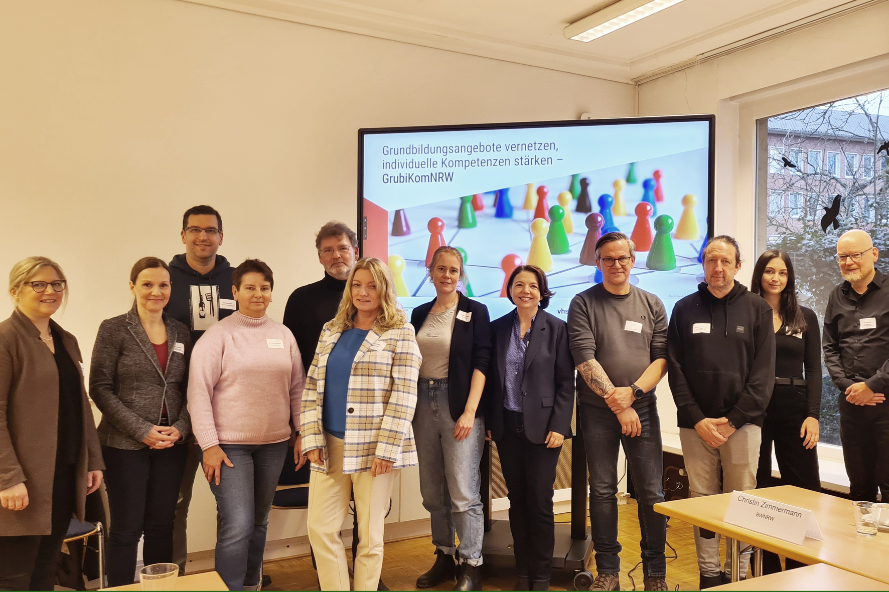 (v.l.n.r.) Stefanie Dobberke (VHS), Elif Aksabun (Landesverband der VHS NRW), David Röttger (Jugendberufshilfe JOKER), Annemarie Doktor (Jobcenter Herten), Hans Ruschmann (rebeq GmbH), Iris Smolinski (Jobcenter Herten), Christine Fester (VHS), Suzana Rieke (Bildungswerk der Nordrhein-Westfälischen Wirtschaft), Frank Armoneit (Haus der Kulturen), Thorsten Schnelle (Agora), Christin Zimmermann (Bildungswerk der Nordrhein-Westfälischen Wirtschaft) und Jens Kemner (Landesverband der VHS NRW) freuen sich über den Auftakt des Projekts.