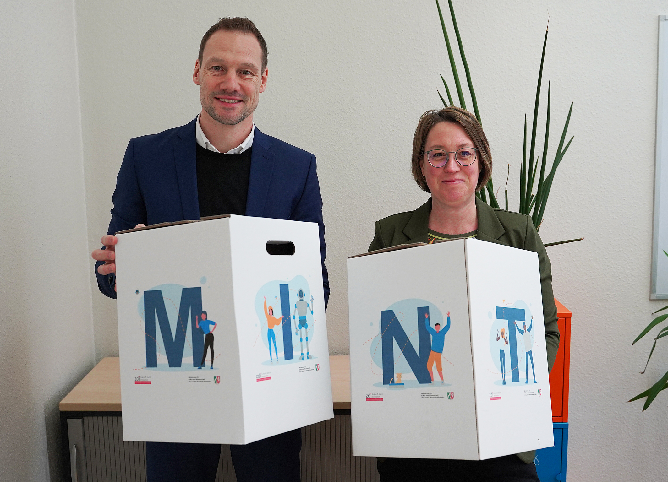 Christian Holterhues (Geschäftsführer WESt, l.) und Dr. Wiebke Wesseling (zdi-Zentrum Kreis Steinfurt) freuen sich über die Förderung.