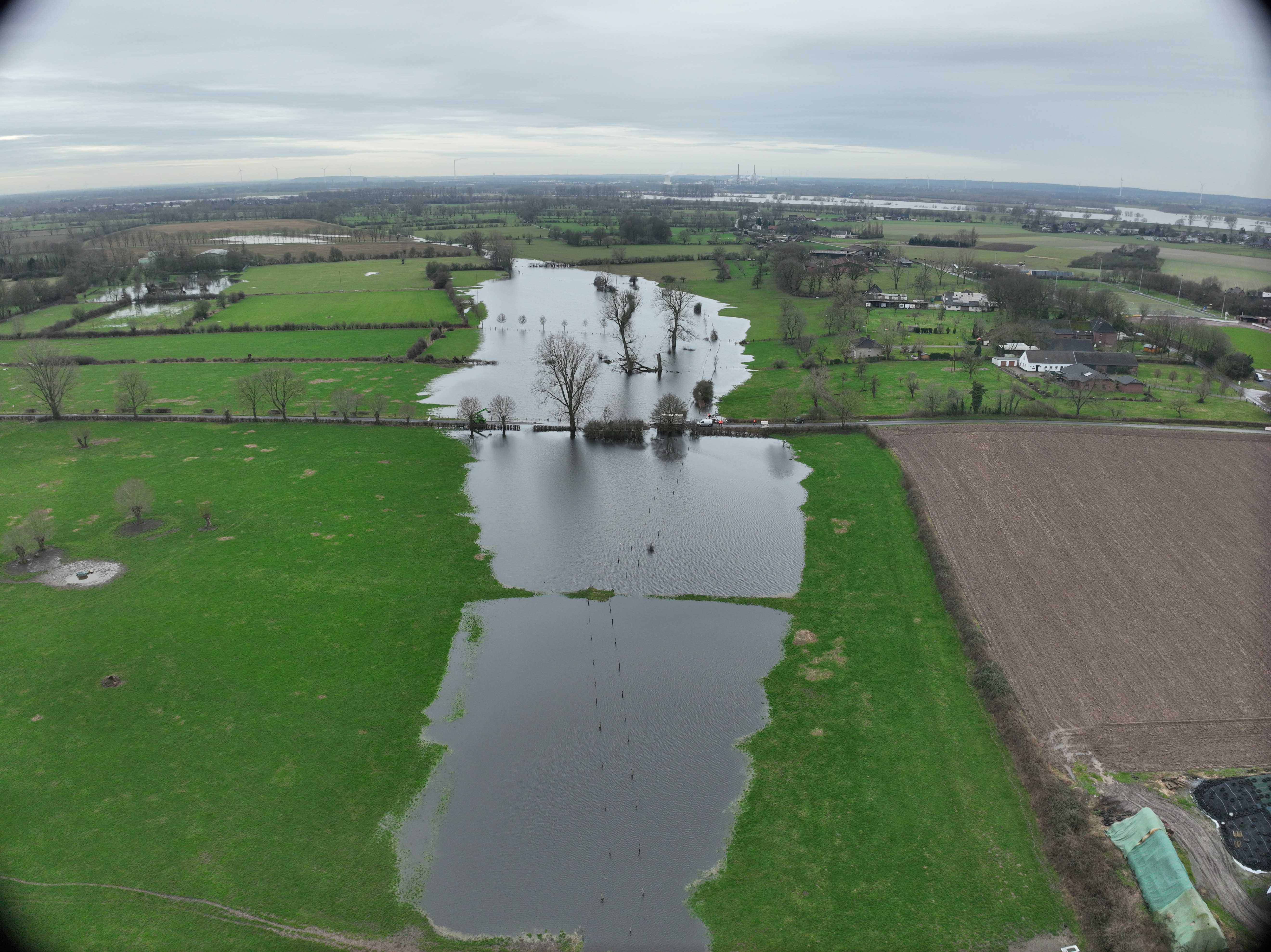 Tagelanger Dauerregen im gesamten Land hatte an den Feiertagen zur Jahreswende 2023/2024 zu hohen Wasserständen im Rhein sowie im Mommbach in Voerde geführt. Die Folge: Nachdem das Wasser aus dem vollen Rhein unterirdisch ins Landesinnere drückte, stieg das Grundwasser in der Mommbach-Niederung an, die Niederung stand unter Wasser.
