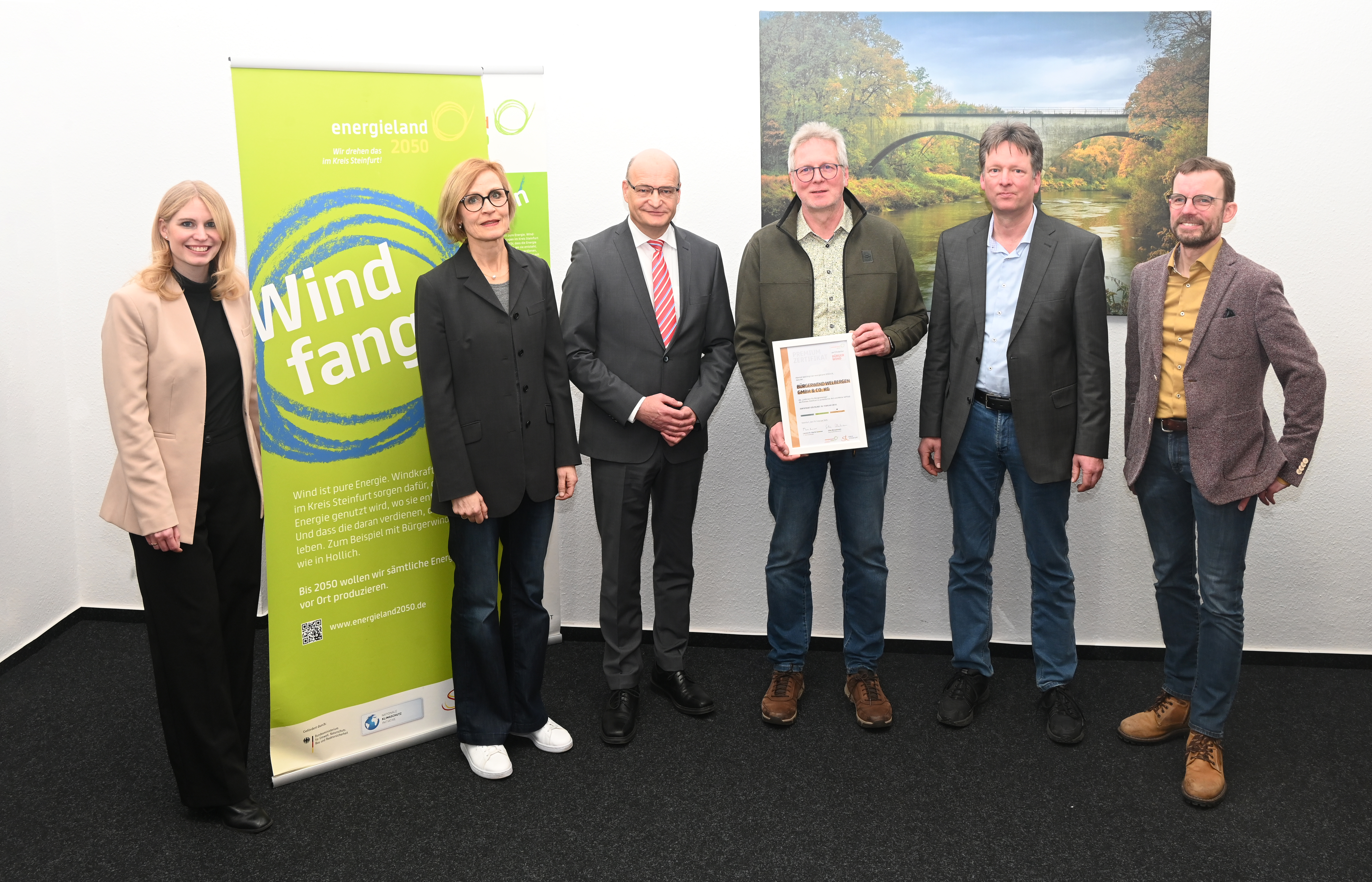 Landrat Dr. Martin Sommer (3. v. l.) überreicht die Urkunde an den Geschäftsführer der Bürgerwind Welbergen, Werner Kappelhoff (3. v. r.).