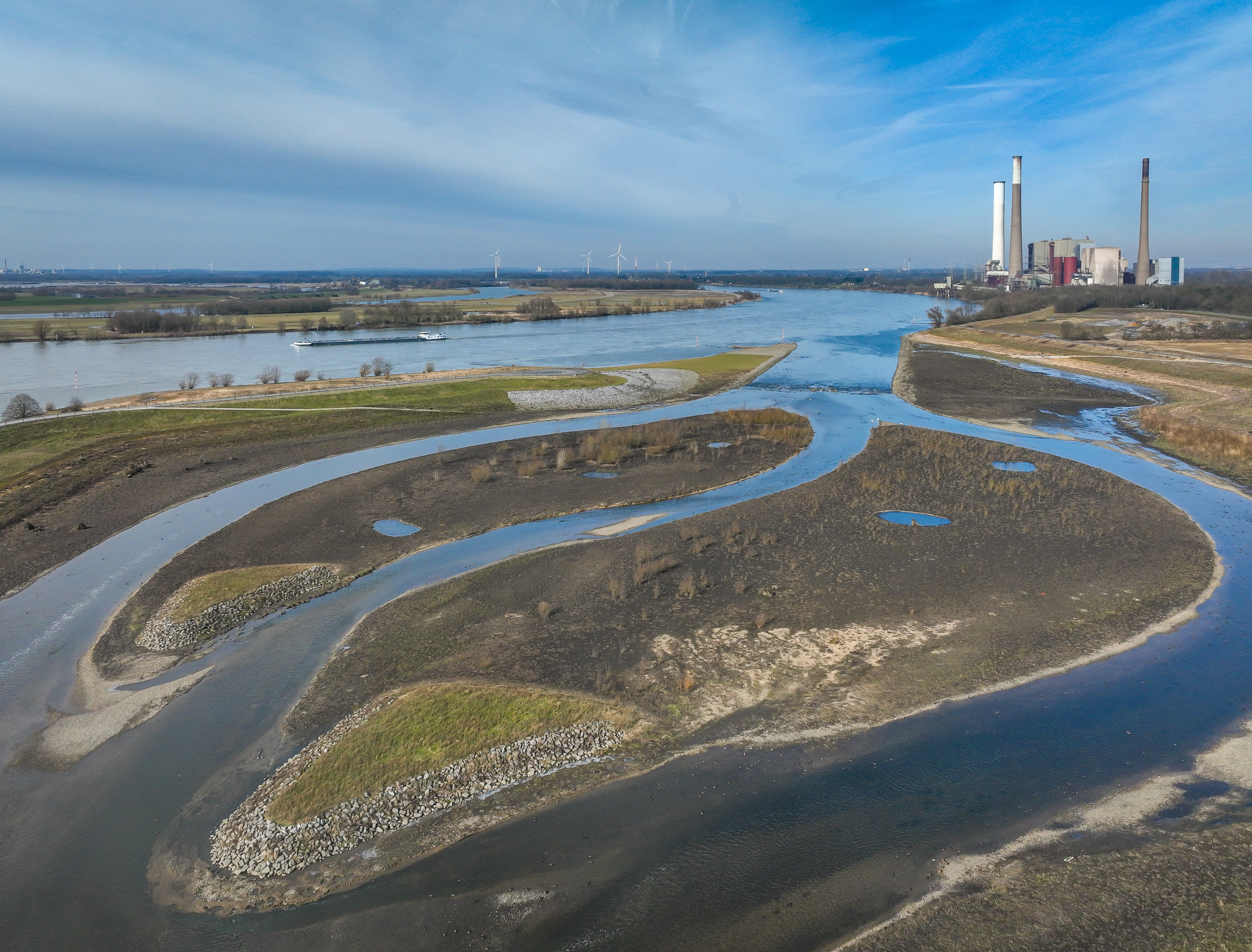 Der neu angelegte Mündungsbereich der Emscher am Rhein bei Dinslaken und Voerde bietet nun eine breite Auenlandschaft, die bei Hochwasser im Rhein diesem als Retentionsraum dient.