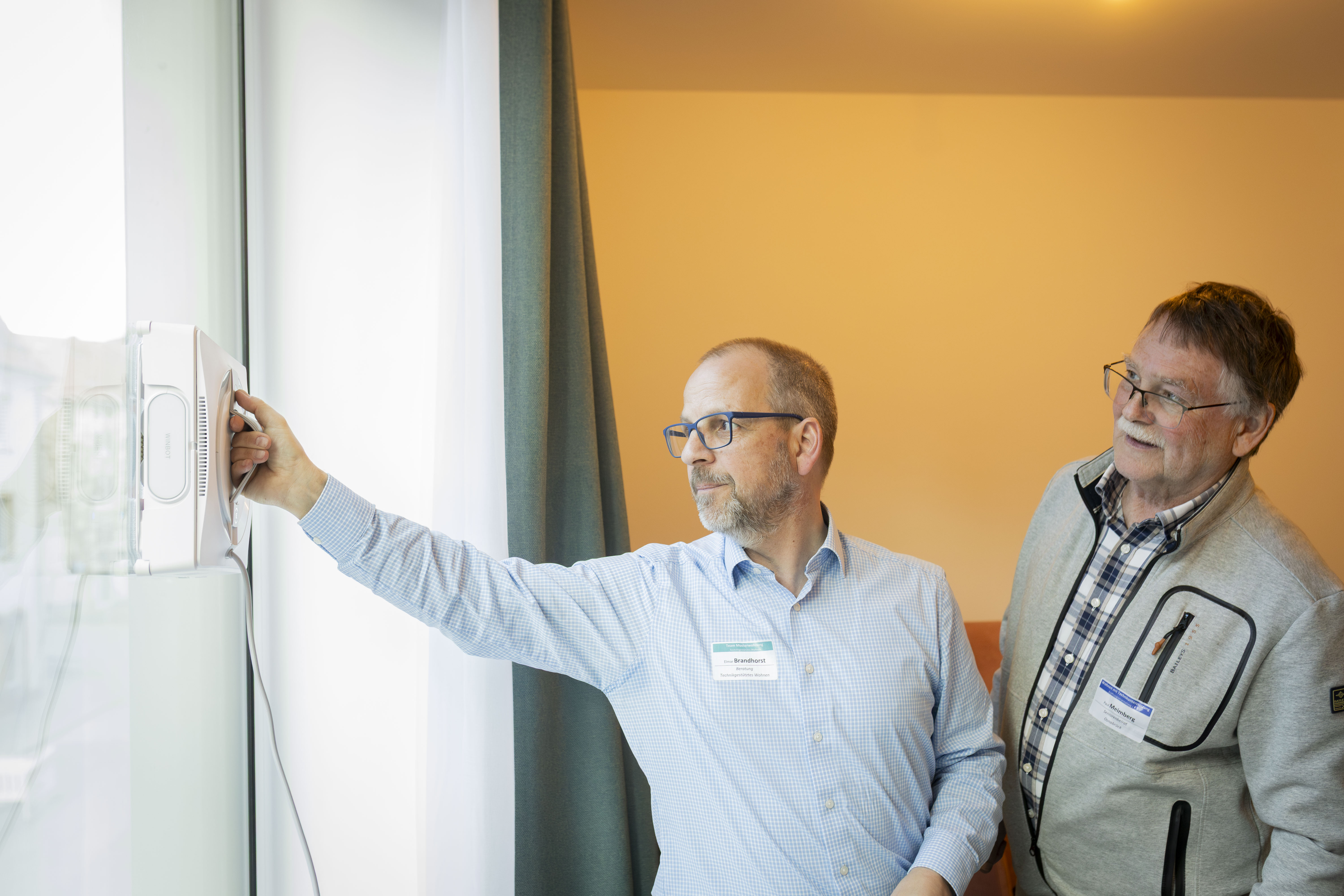 Vorführen, ausprobieren, erklären lassen: Der ehrenamtliche Berater Elmar Brandhorst (links) stellt in der Musterwohnung eine praktische Lösung zur Fensterreinigung vor. Paul Meimberg vom Seniorenbeirat lauscht aufmerksam.