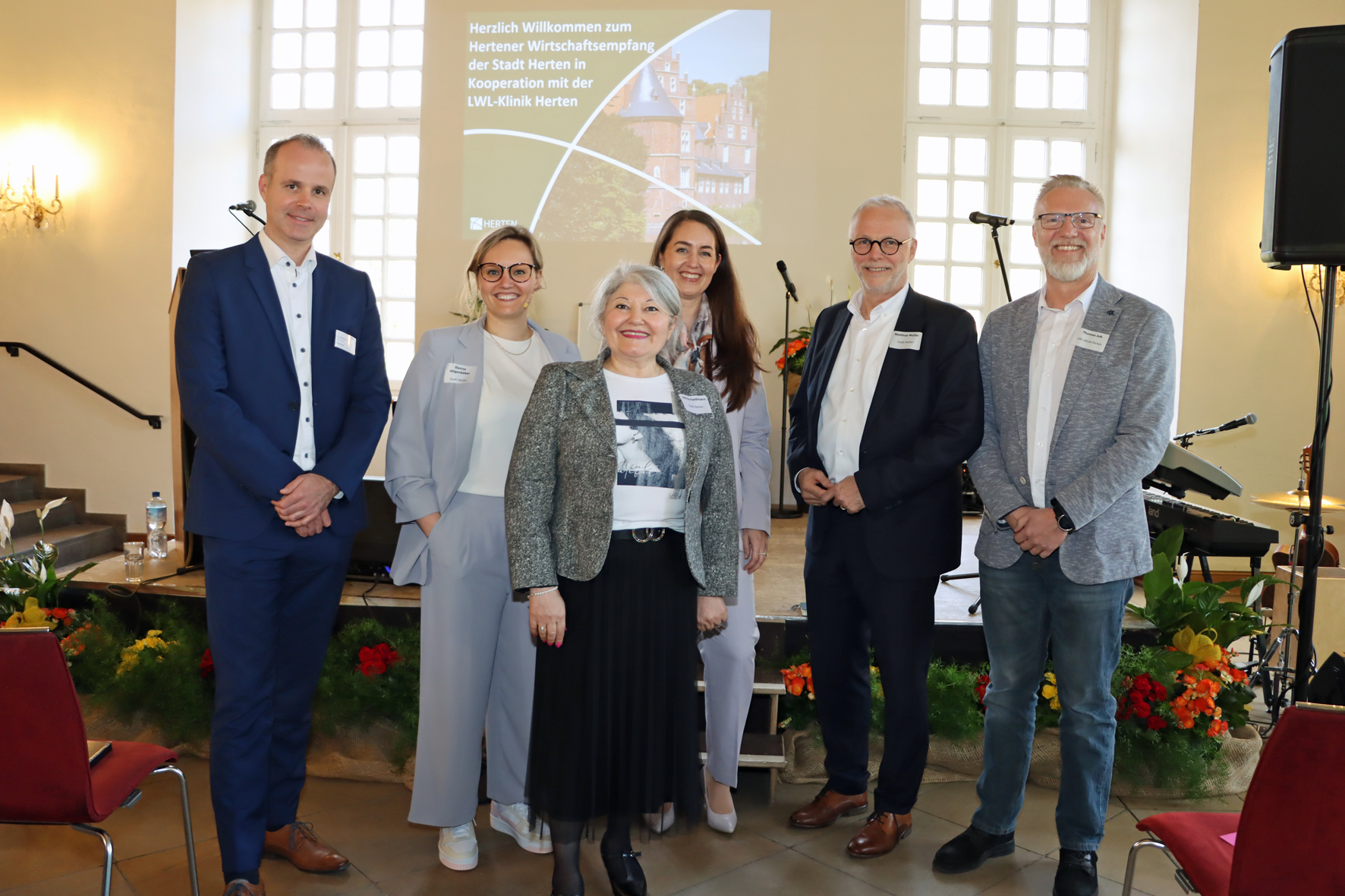 Bürgermeister Matthias Müller (2.v.r.) begrüßte gemeinsam mit Stadtbaurätin Janine Feldmann (3.v.l.), Carina Christian, Amtsleitung Stadtentwicklung (3.v.r.), Denise Hilgenböker, Leiterin der Wirtschaftsförderung (2.v.l.), sowie Thomas Job, kaufmännischer Direktor der LWL Klinik (rechts) und Dr. Johannes Albers, ärztlicher Direktor der LWL-Klinik Herten (links), die Gäste zum Wirtschaftsempfang.
