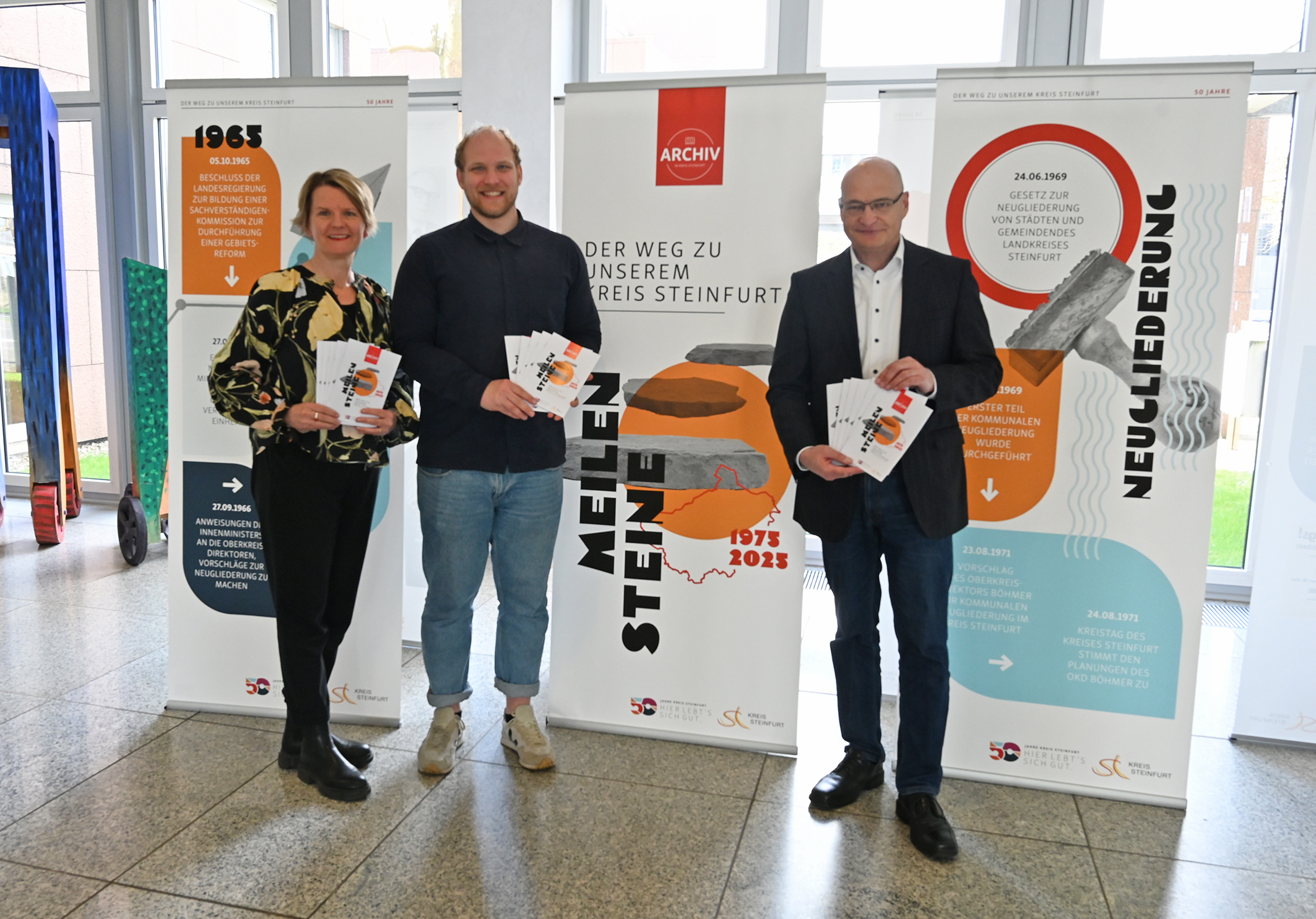 Landrat Dr. Martin Sommer (v. r.), Kreisarchivar Jannik Schröder und Kreis-Kulturamtsleiterin Kirsten Weßling freuen sich, dass die Ausstellung „Meilensteine – Der Weg zu unserem Kreis Steinfurt“ in mehreren Kommunen zu sehen sein wird.