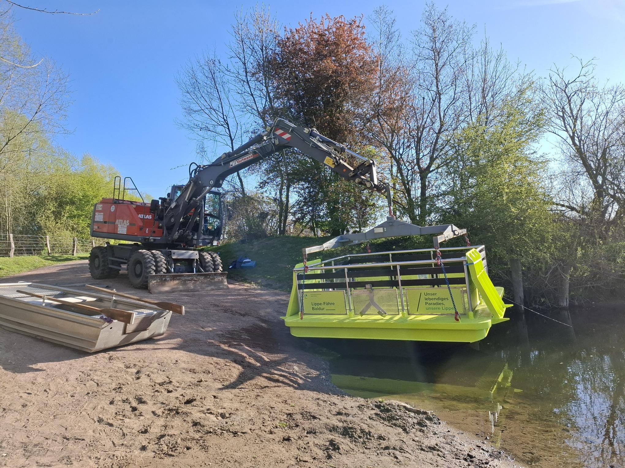 Die fast zwei Tonnen schwere Fähre "Baldur" geht - wie ihre Schwester-Fähre "Maifisch" - in der kommenden Woche ins Winterlager. Die Fähren werden dafür an Baggerhaken an Land gehoben.