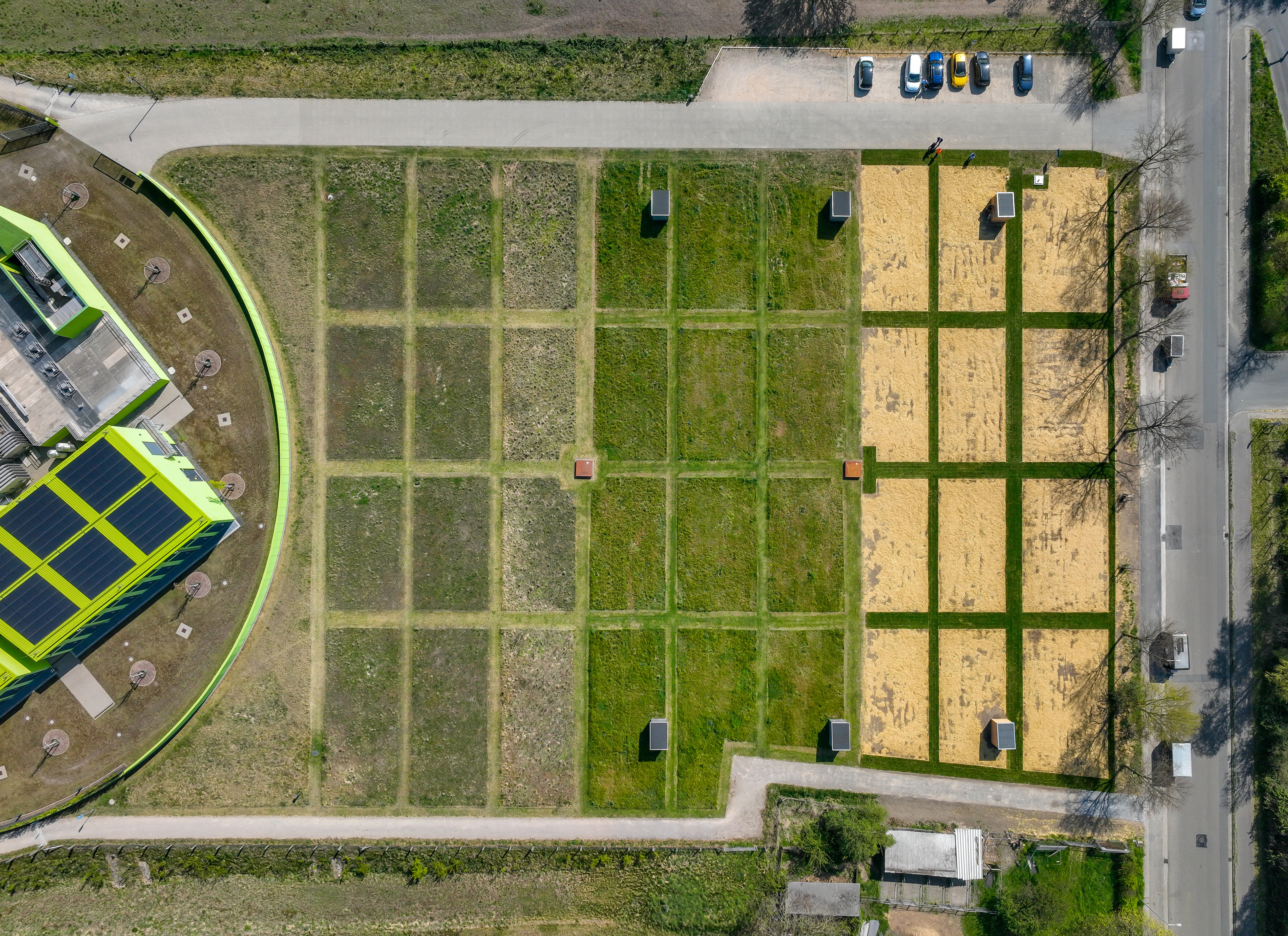 Im Bereich des Pumpwerks Oberhausen in Biefang hat die Emschergenossenschaft den Vorplatz so herrichten lassen, dass mehrere Parzellen entstanden sind. Die zwölf helleren, mit Stroh bedeckten Teilstücke stehen demnächst interessierten Bürgerinnen und Bürgern zur Verfügung.