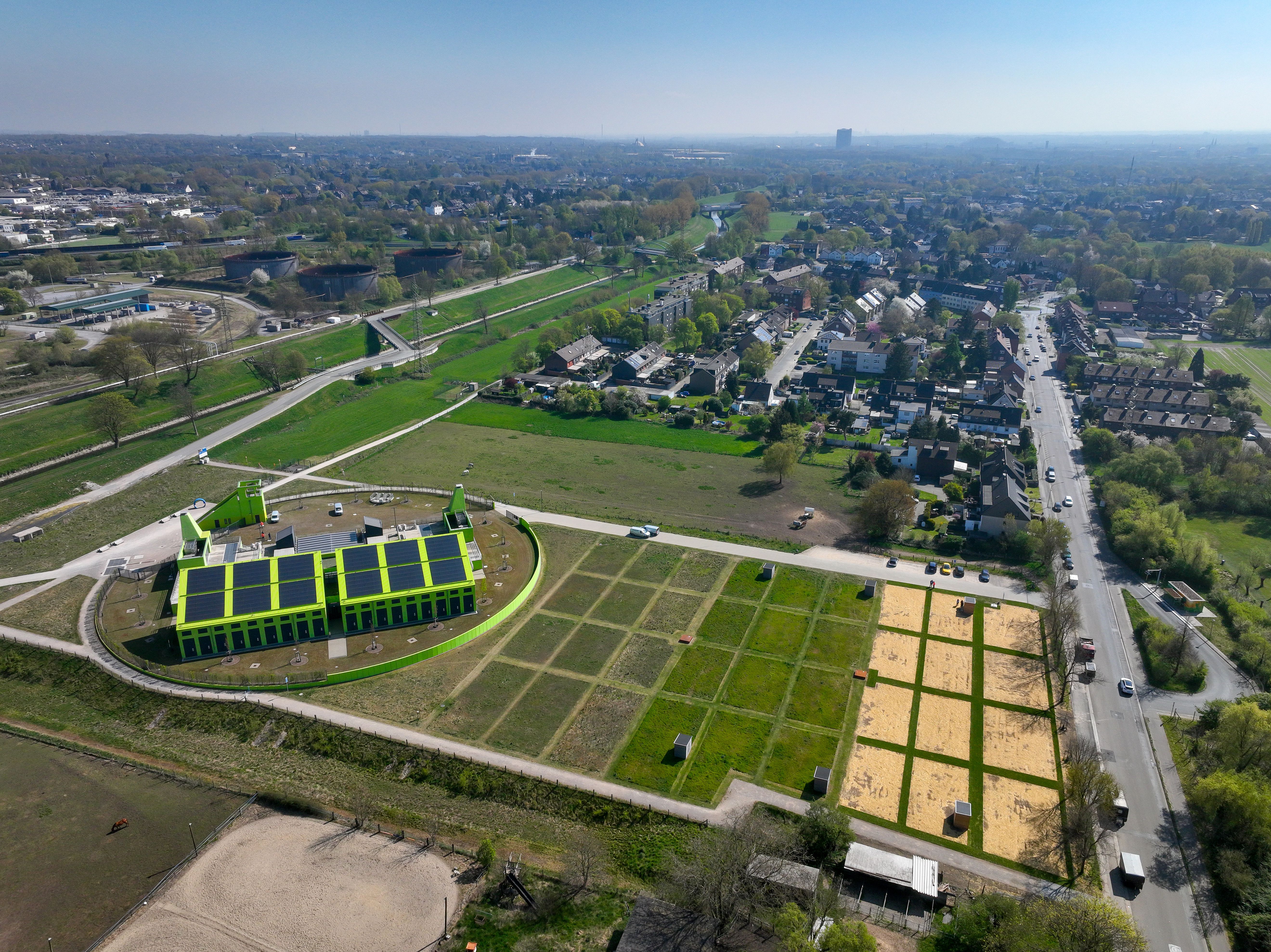 Im Bereich des Pumpwerks Oberhausen in Biefang hat die Emschergenossenschaft den Vorplatz so herrichten lassen, dass mehrere Parzellen entstanden sind. Die zwölf helleren, mit Stroh bedeckten Teilstücke stehen demnächst interessierten Bürgerinnen und Bürgern zur Verfügung.