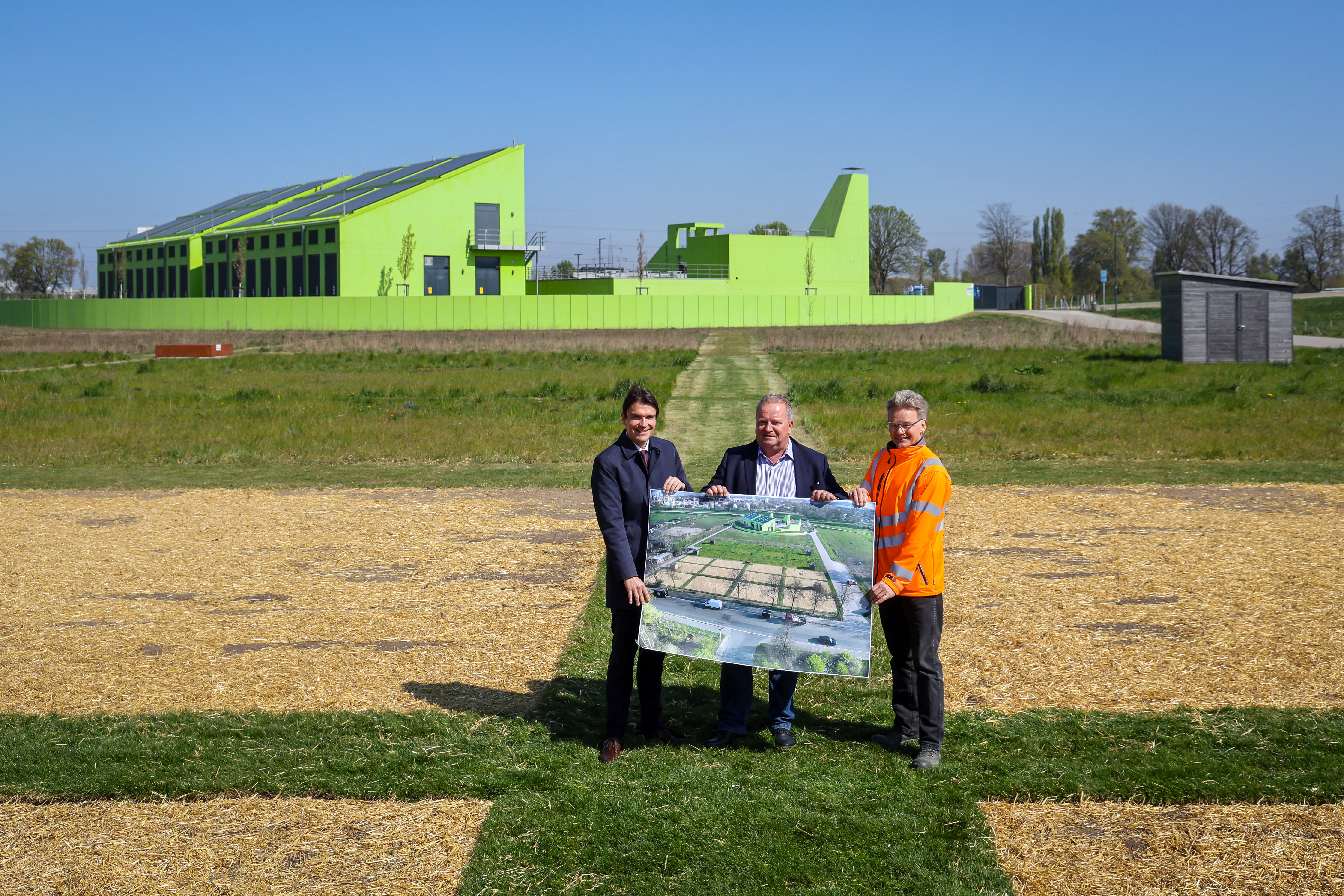 Prof. Dr. Uli Paetzel (Vorstandsvorsitzender Emschergenossenschaft), Peter Knappmann (Geschäftsführer der beauftragten Firma Knappmann) und Johannes Siepenkötter (Projektleiter Emschergenossenschaft) präsentieren die zwölf Urban Gardening-Parzellen vor Ort. Im Bereich des Pumpwerks Oberhausen in Biefang hat die Emschergenossenschaft den Vorplatz so herrichten lassen, dass mehrere Parzellen entstanden sind. Die zwölf helleren, mit Stroh bedeckten Teilstücke stehen demnächst interessierten Bürgerinnen und Bürgern zur Verfügung.