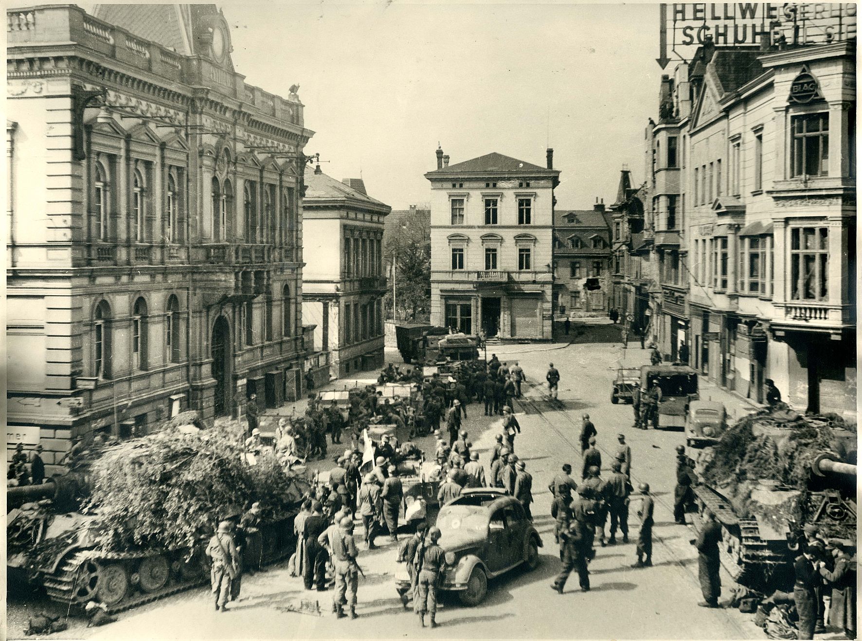 Amerikanisches Militär und deutsche Jagdpanzer („Jagdtiger“) auf dem Adolf-Hitler-Platz (heute: Alter Rathausplatz) während der Verhandlungen zur Übergabe der Stadt Iserlohn an die amerikanischen Truppen im Rathaus am 16. April 1945.