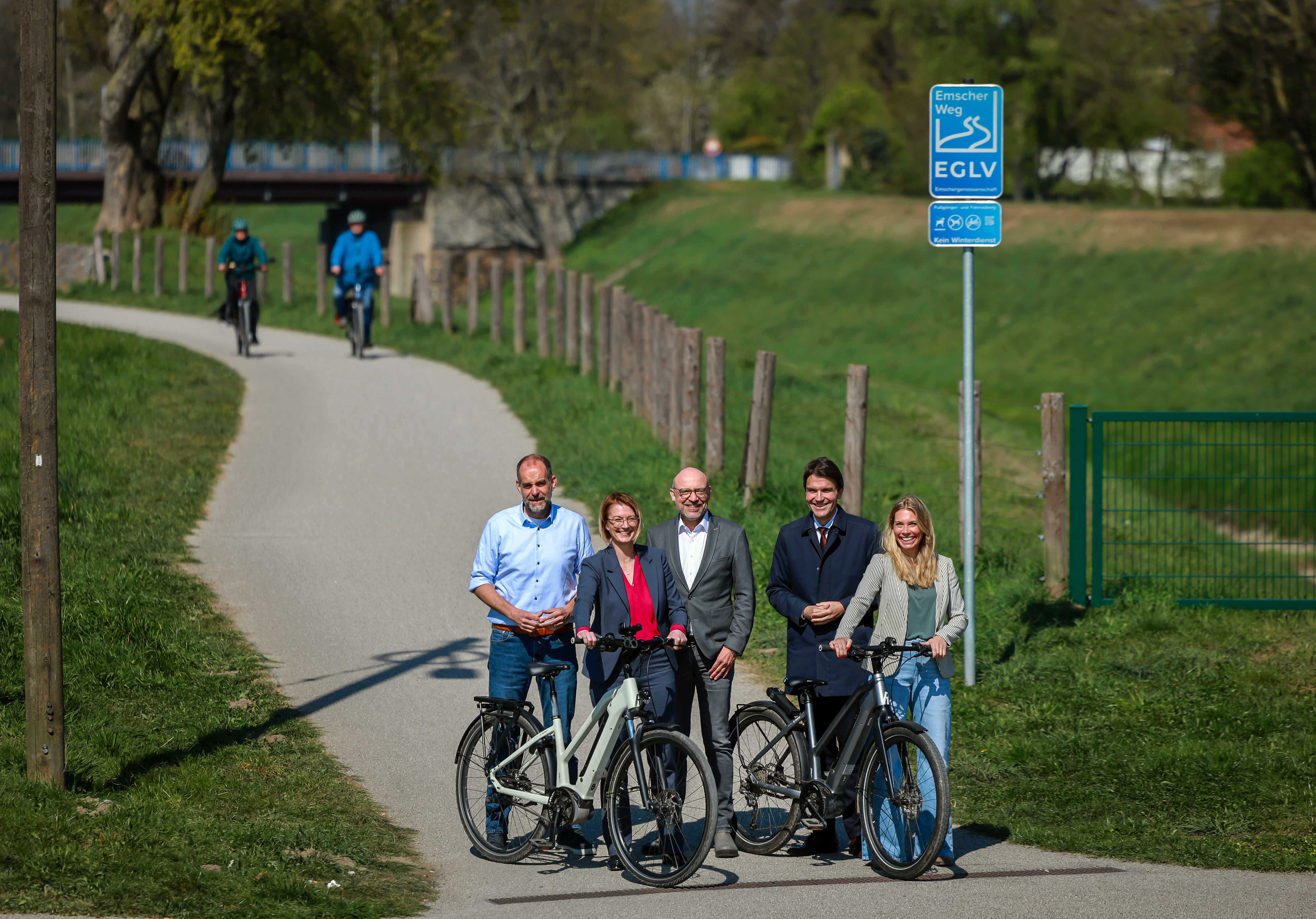 Eine neue Kooperation zwischen der Emschergenossenschaft (EG) und der Ruhr Tourismus GmbH (RTG) soll das touristische Potenzial des Emscher-Weges stärker ausschöpfen. Auf dem Bild zu sehen sind (v.li.): Christoph Lottritz (RTG), Susanne Linnebach (EG), Axel Biermann (RTG), Prof. Dr. Uli Paetzel (EG) und Jasmin Conradt (EG).