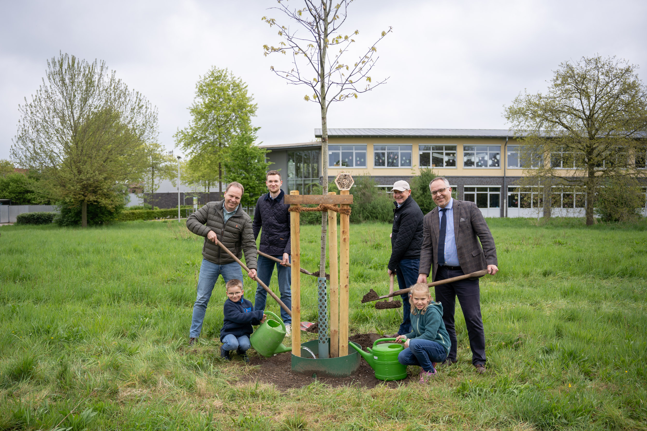 Gemeinsam mit den Kindern Lio und Ida und seinem Sohn Julius Lübberdink (2. von links) pflanzt der Bocholter Stadtverordnete Bernhard Lübberdink (2. von rechts) den Jahresbaum. Mit dabei: Bocholts Bürgermeister Thomas Kerkhoff und Claus Wiemker vom Fachbereich Mobilität und Umwelt.