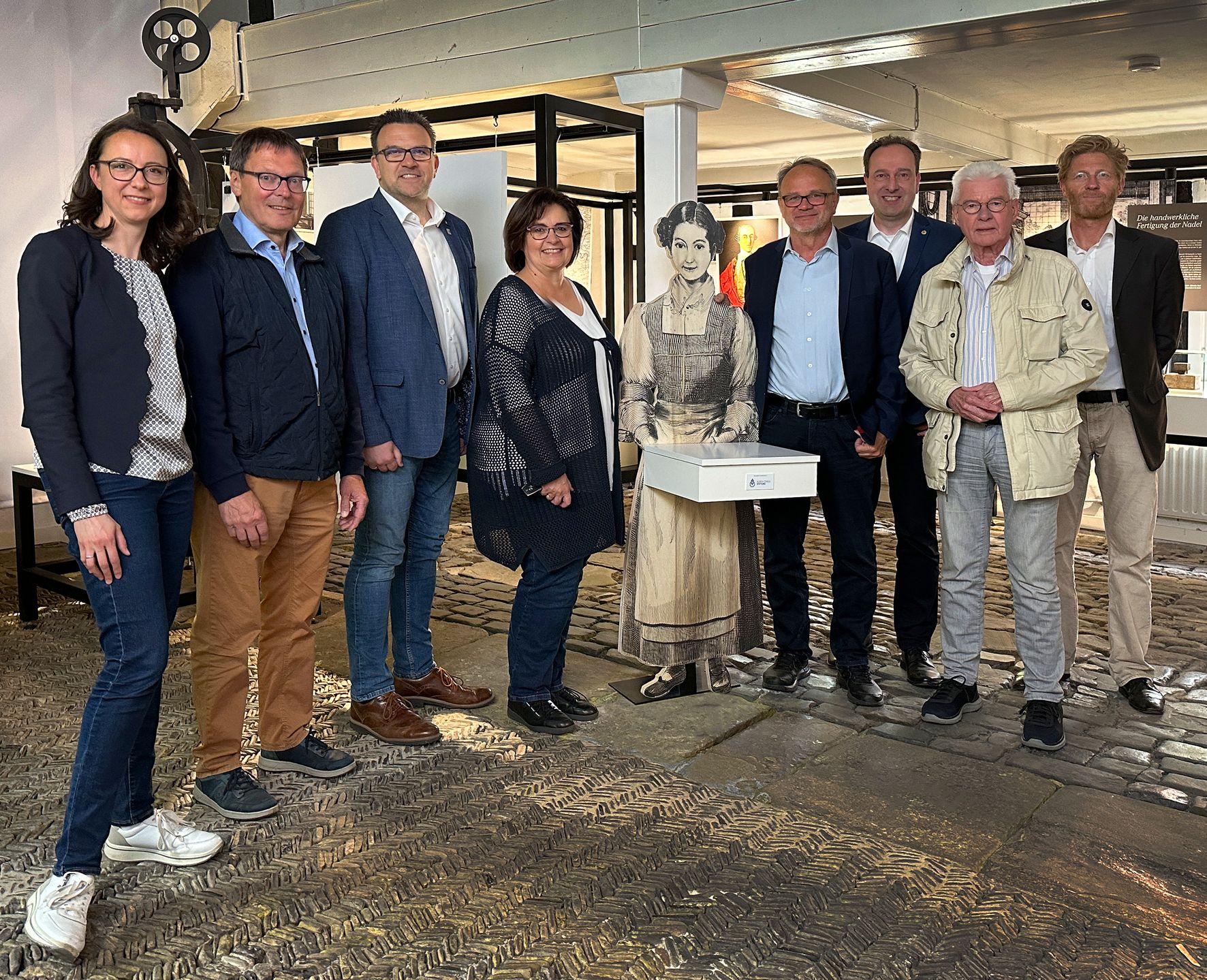 Auf die Eröffnung des Nadelmuseums freuen sich Museumsleiterin Dr. Sandra Hertel, Thomas Laatsch (Lions Club), Bürgermeister Michael Joithe, Ingeborg Woywod (Sparkasse Iserlohn), Andreas Heine (Kirchhoff Automotive), Dr. Christian Wingendorf (Lions), Ulrich Thiele (Ulrich-Thiele-Stiftung) und Christian Assmann (Gerhard Weyland KG).