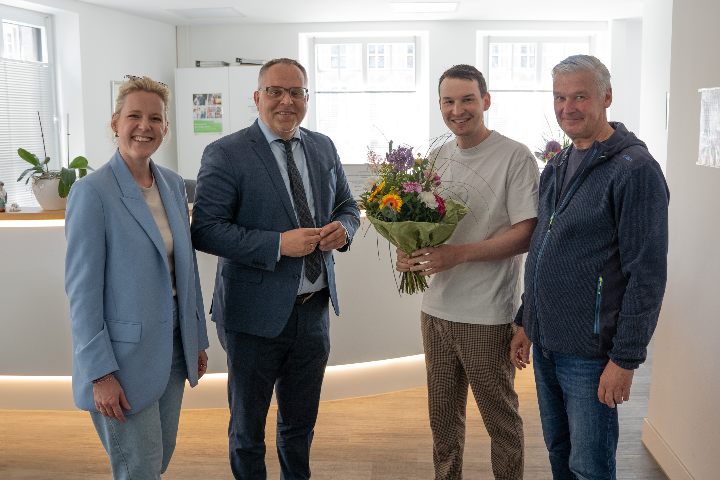 Gemeinsam mit Bürgermeister Thomas Kerkhoff begrüßt Lisa Knuf den Mediziner Timo Sigmund (2. von rechts), der die Praxis künftig mit seinem Vater Dr. med. Björn Sigmund führen wird.