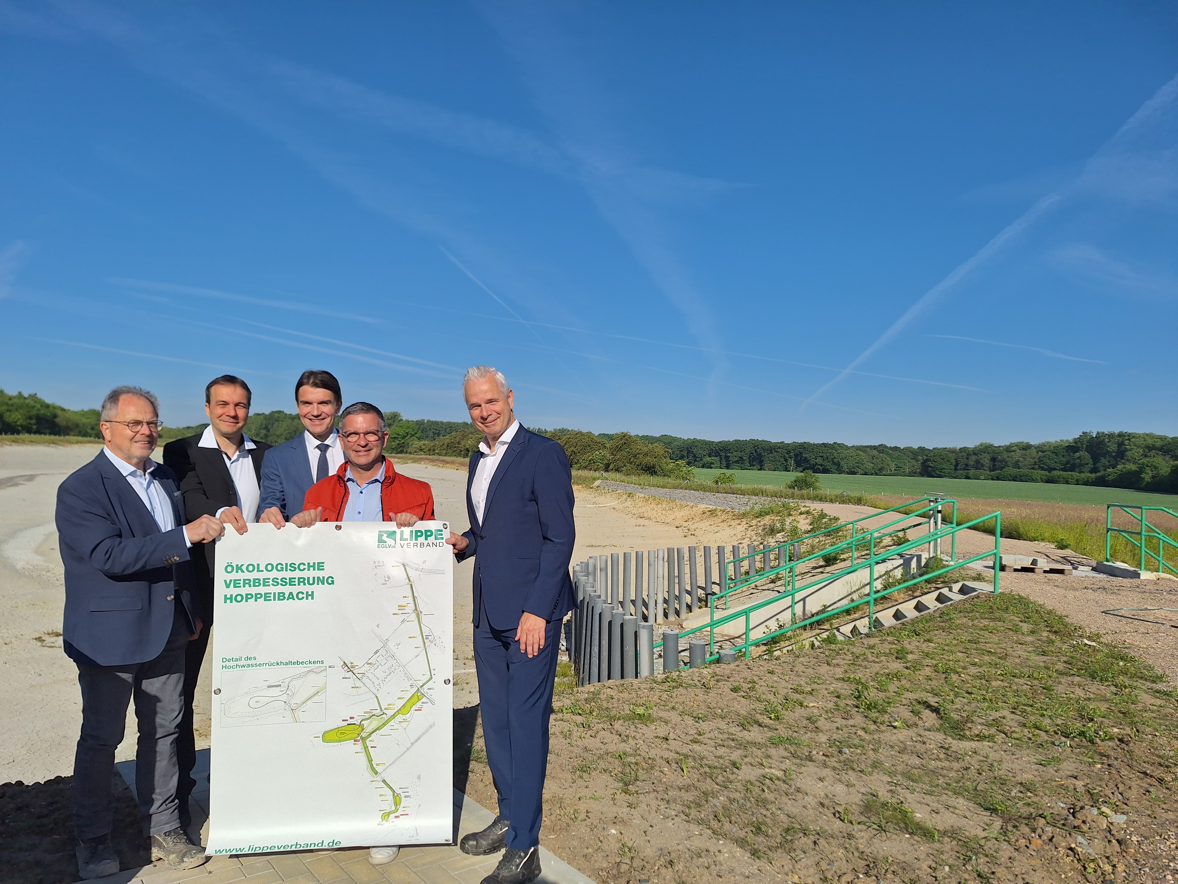 Besichtigten das fertige Hochwasserrückhaltebecken am Hoppeibach in Hamm: Projektleiter Gregor Santehanser vom Lippeverband, der Prokurist der RAG Marcel Tiedeken, Prof. Dr. Uli Paetzel (Vorstandsvorsitzender des Lippeverbandes), Hamms Oberbürgermeister Marc Herter und Dr. Frank Obenaus, Technischer Vorstand des Lippeverbandes.