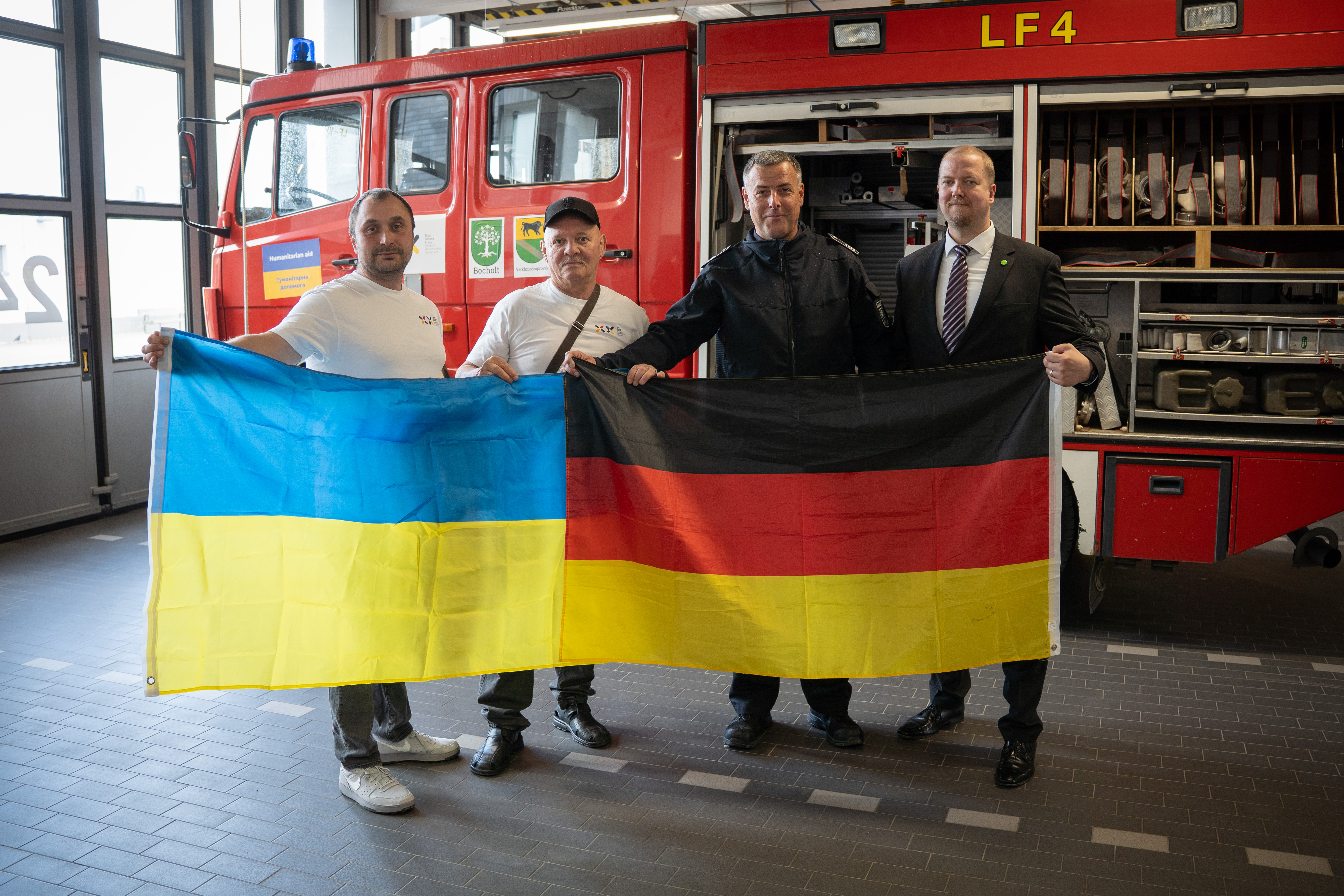 Gemeinsam überreichen (von rechts) der Erste Stadtrat Björn Volmering und Robert Liebrand von der Feuerwehr Bocholt den Einsatzwagen an Oleksandr Shyshkin und Yurii Yakubovskyi vom Verein Gelbes Kreuz.