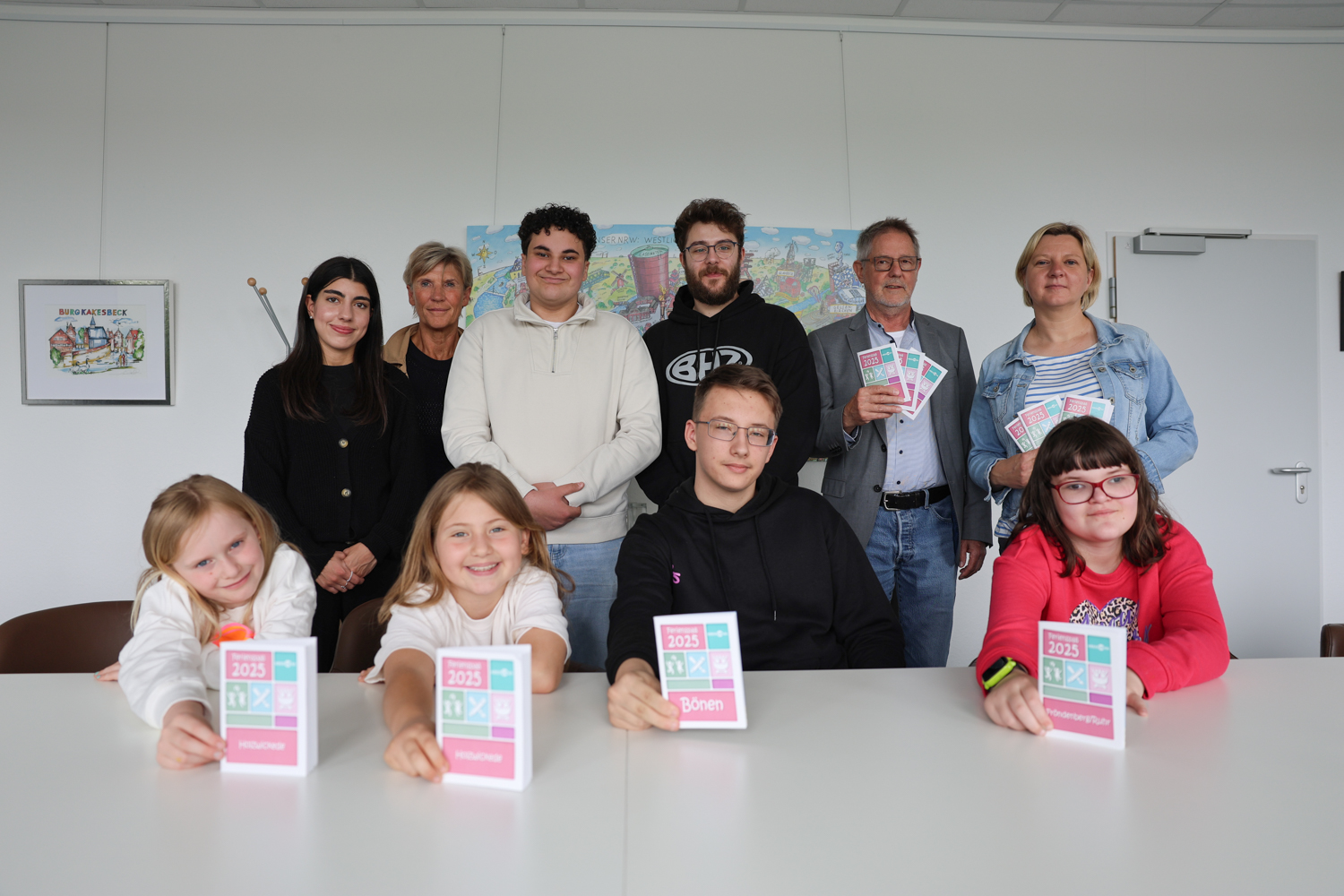 Vorne von links: Carla Daberkow (8), Liya Taslak (9), Logan Behrends (15), Ronja Beuke (10). Hinten links: Nurten Özkaya vom Treffpunkt Villa, Ilka Essers, Melia Turan (17), Julian Schäfer vom Go In, Norbert Enters, Yvonne Rome vom Treffpunkt Villa.