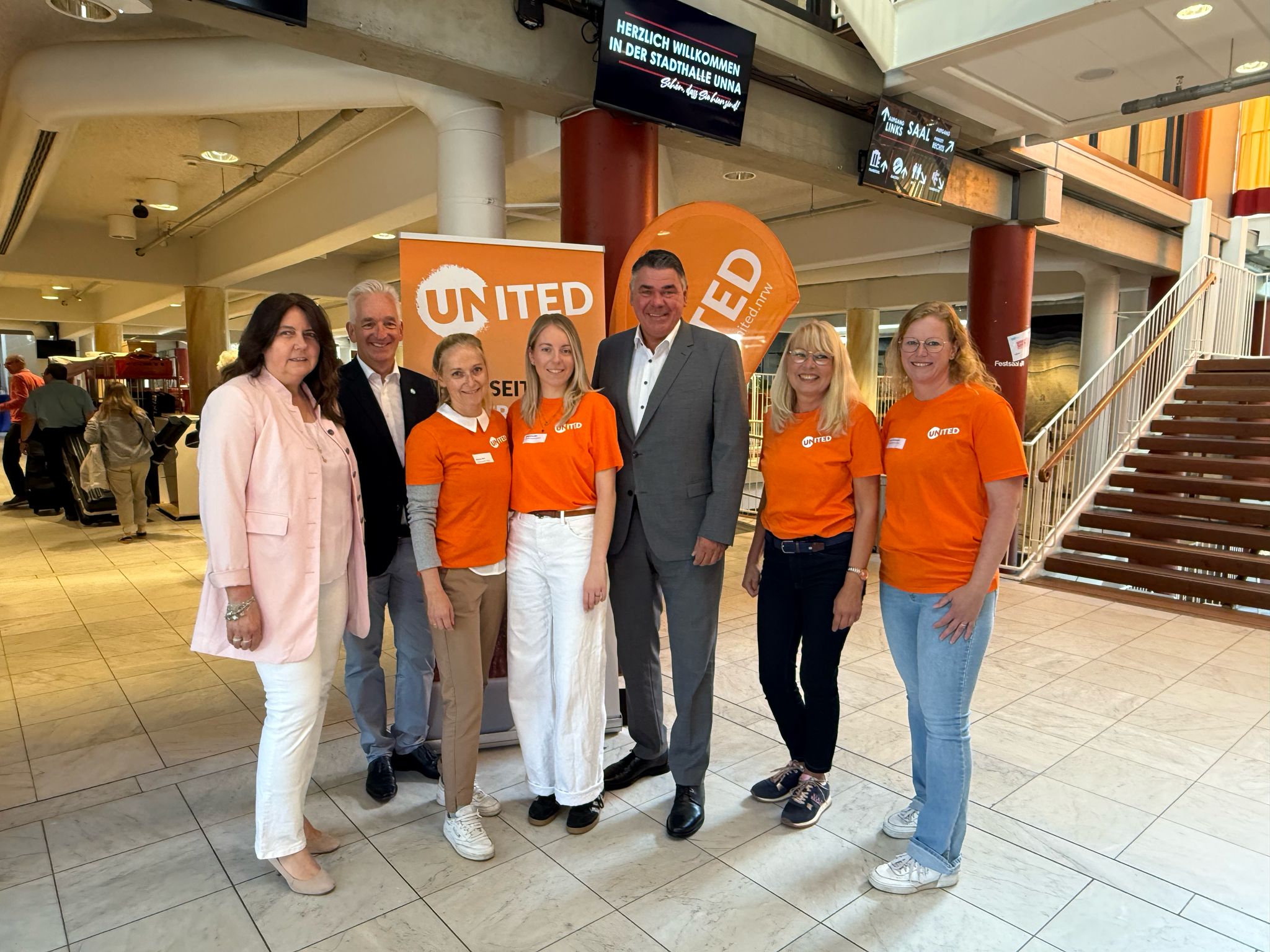Das Team von UNITED.nrw mit Landrat Mario Löhr (3.v.r.): Von links Anja Seeber (Leiterin Fachbereich Schulen und Bildung), Sven Brüggenhorst (Schuldezernent), Katharina Klein (UNITED), Madeleine John (UNITED), Martina Bier (UNITED) und Kirsten Reichenbach (UNITED).