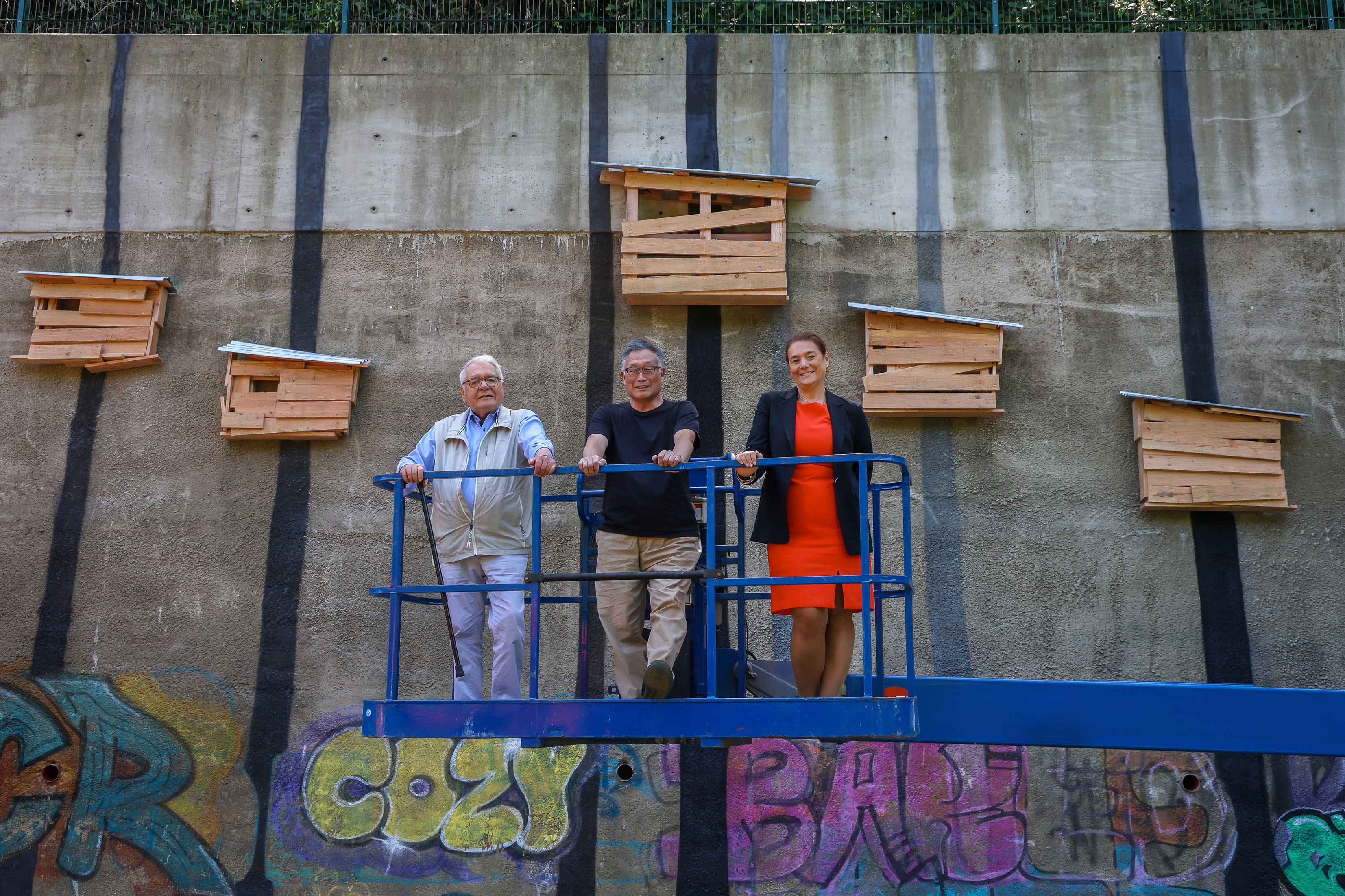 Der Bottroper Bürgermeister Klaus Strehl (l.) und Liana Weismüller (Vorständin für Personal und Nachhaltigkeit bei der Emschergenossenschaft) weihten gemeinsam mit dem Künstler Tadashi Kawamata das neue Kunstwerk „Tree Hut on the Wall“ an der Boye ein.
