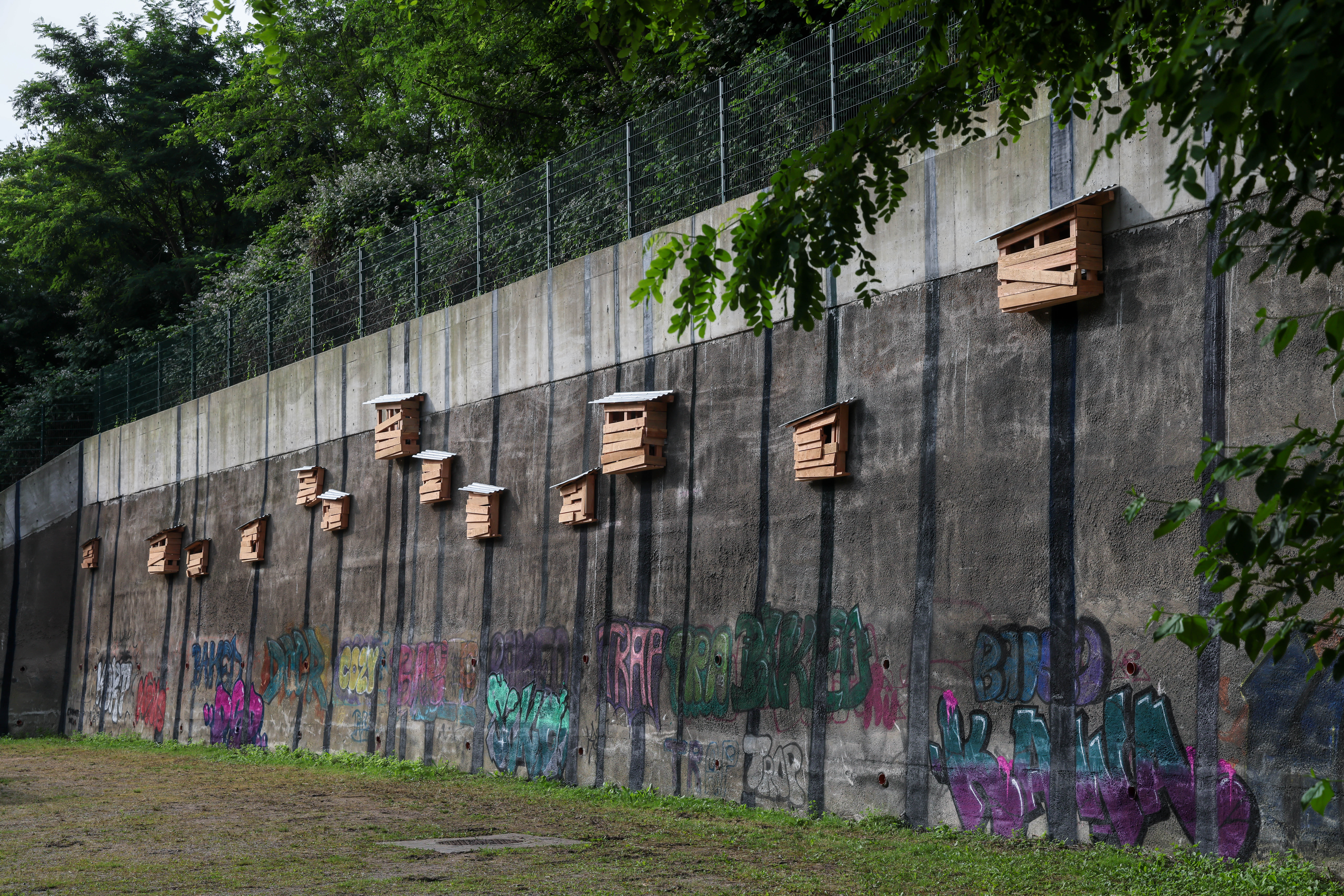 Das Kunstwerk „Tree Hut on the Wall“ besteht aus einer gemalten Baumkulisse und mehreren Holzkonstruktionen, die von Vögeln als Nistkästen verwendet werden können. Sie sind an eine ehemalige Stützwand des Abwasserkanals Boye angebracht, die einst für den Bau des Abwasserkanals benötigt wurde.