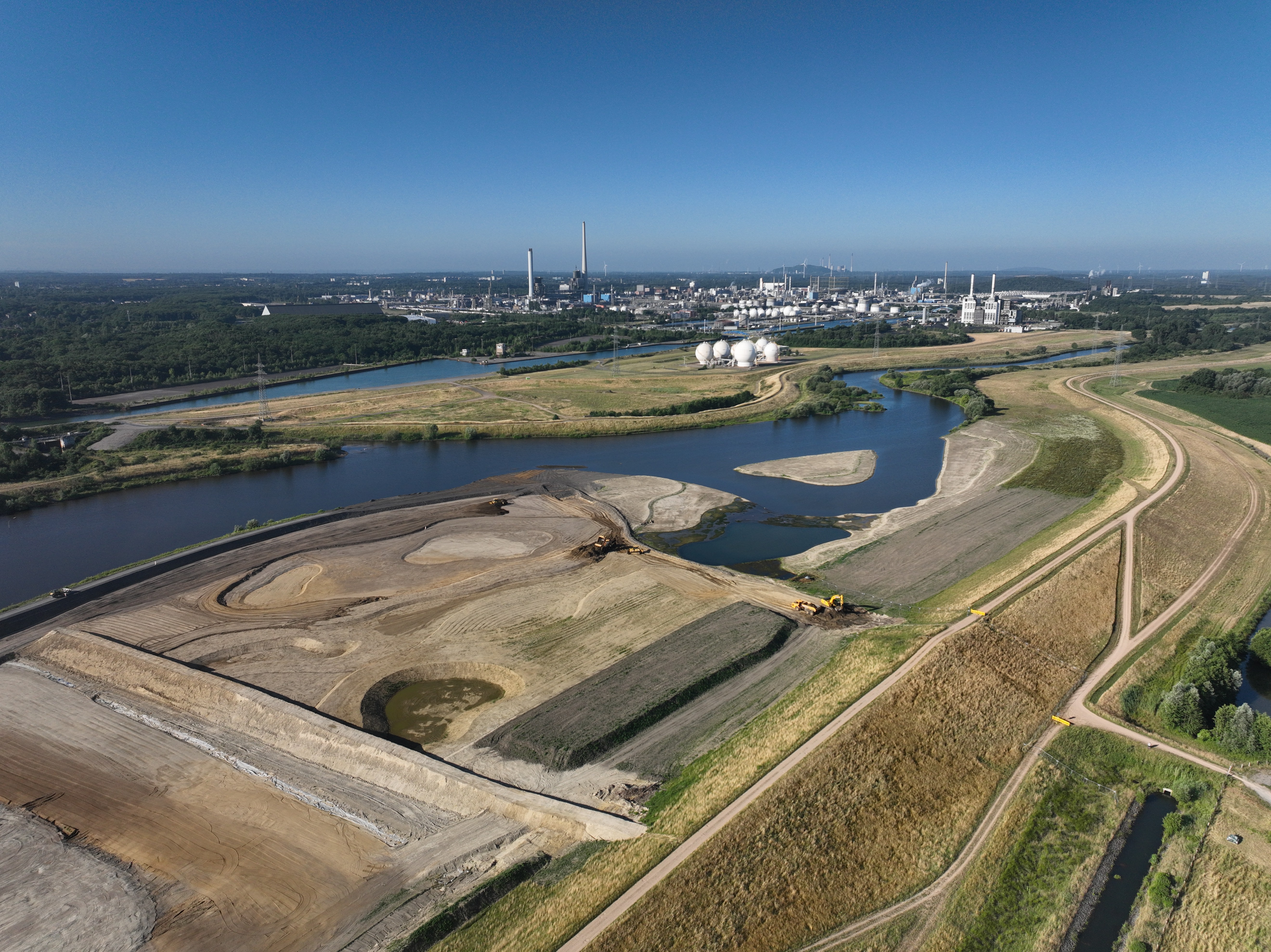 Der Bereich vom Absperrdeich vorne links im Bild bis zu den Baumaschinen wird in diesem Monat fertiggestellt. Hier sind bereits Modellierungen – wie zum Beispiel einige Vertiefungen – zu sehen.