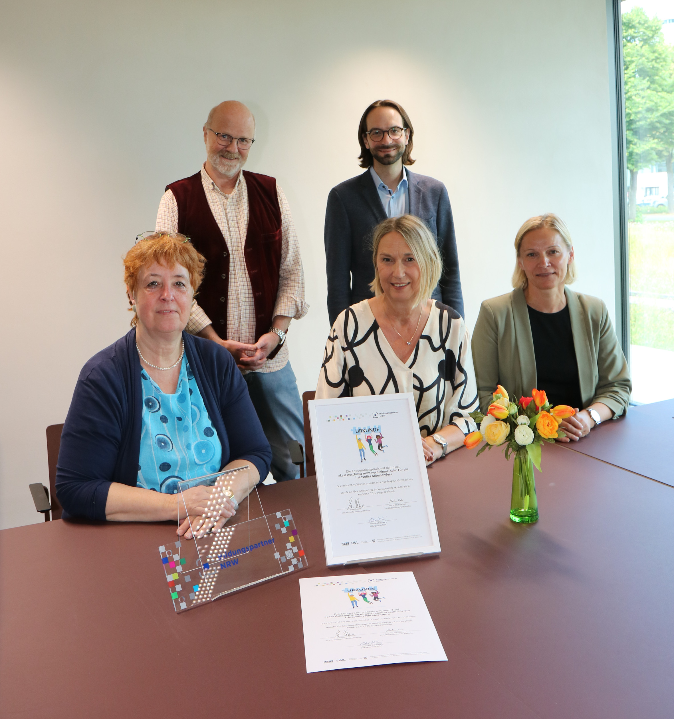 Hintere Reihe (v.l.n.r.): Andreas Weinhold (Ansprechpartner von Bildungspartner NRW für die Kooperation zwischen Archiven und Schulen), Dr. Matthias Herm (stellvertretender Leiter des Kreiarchivs). Vordere Reihe (v.l.n.r.): Sigrid Meyer-Süsterhenn (Projektverantwortliche des Kreisarchivs), Ursula Deggerich (Schulleiterin des Albertus-Magnus-Gymnasiums) und Eva-Christina Neußen (Koordinatorin der Projektwoche).