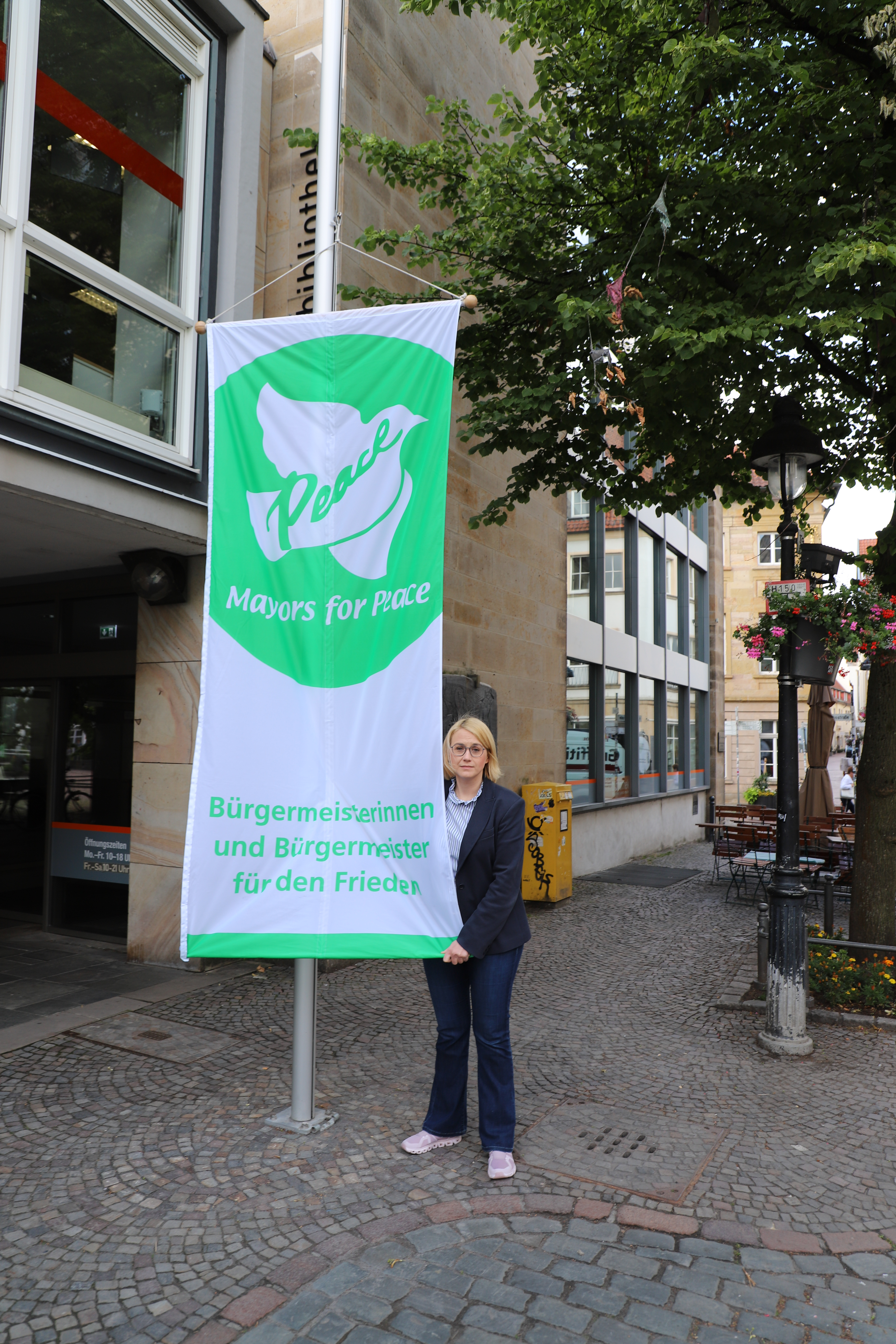 Osnabrücks Oberbürgermeisterin Katharina Pötter mit der Flagge der Mayors of Peace.
