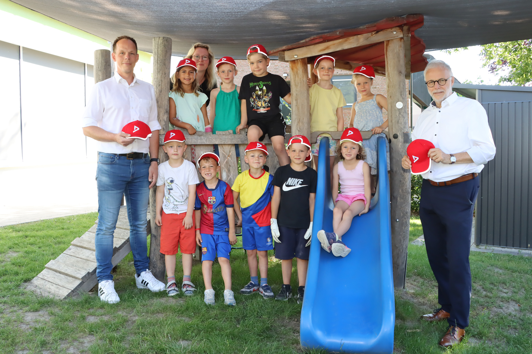 Die Vorschulkinder des Katholischen Kindergartens St. Antonius erhielten stellvertretend für alle Vorschulkinder in Herten signalrote DEKRA-Kappen. Bürgermeister Matthias Müller (rechts), Torben Krumme (links), Außenstellenleiter der DEKRA Recklinghausen, und Kindergartenleiterin Jessica Knof (im Hintergrund) verteilten die Kappen, damit die Kinder bei ihrem Weg zur Schule sicher sind.