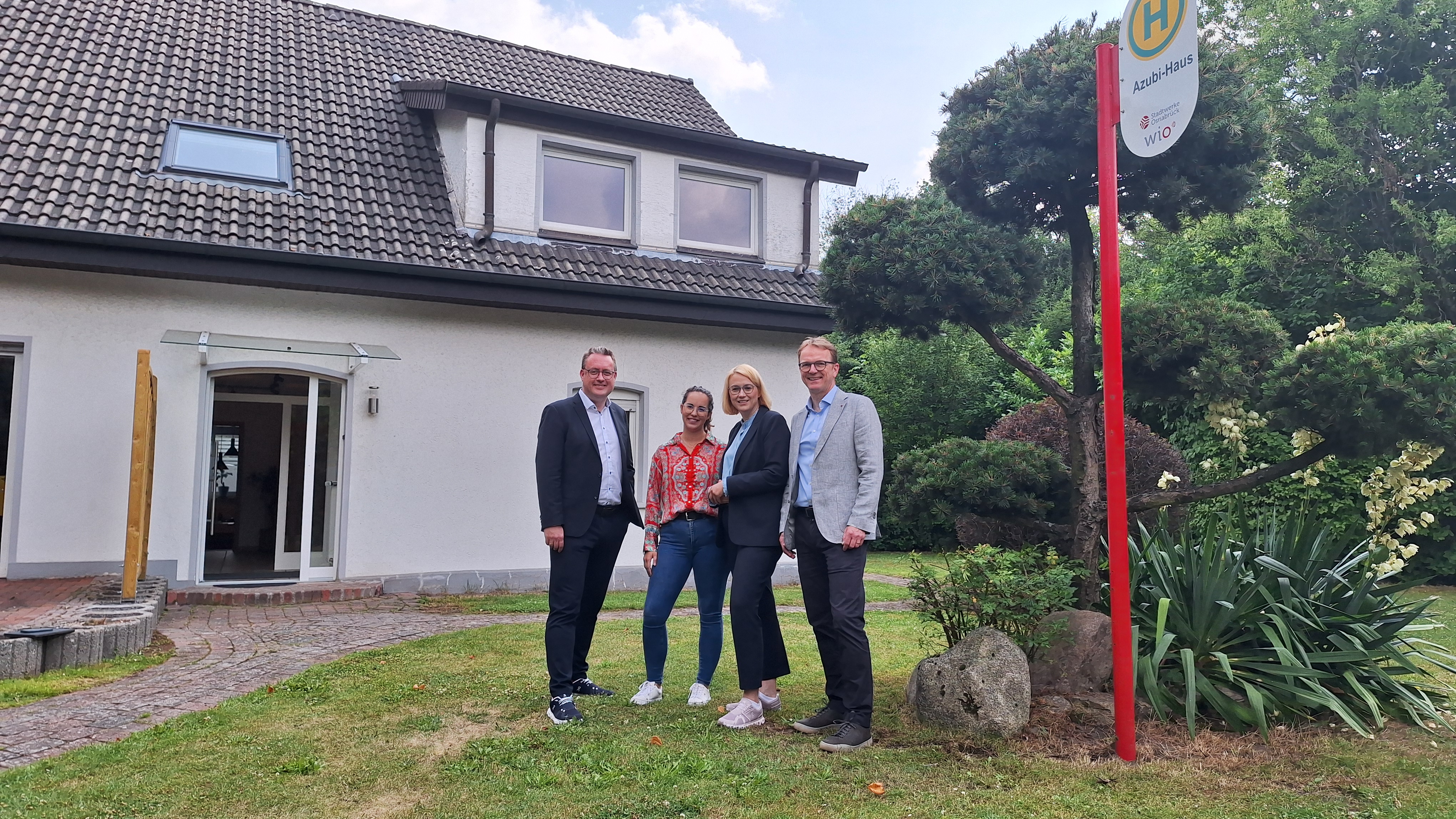 Zu Besuch am neuen Azubi-Haus der Stadtwerke (von links): Ingmar Bojes, Geschäftsführer der Wirtschaftsförderung Osnabrück (WFO), Lena Berg, Projektleiterin der WiO – Wohnen in Osnabrück GmbH, Oberbürgermeisterin Katharina Pötter und Dirk Eichholz, Finanzvorstand der Stadtwerke Osnabrück.