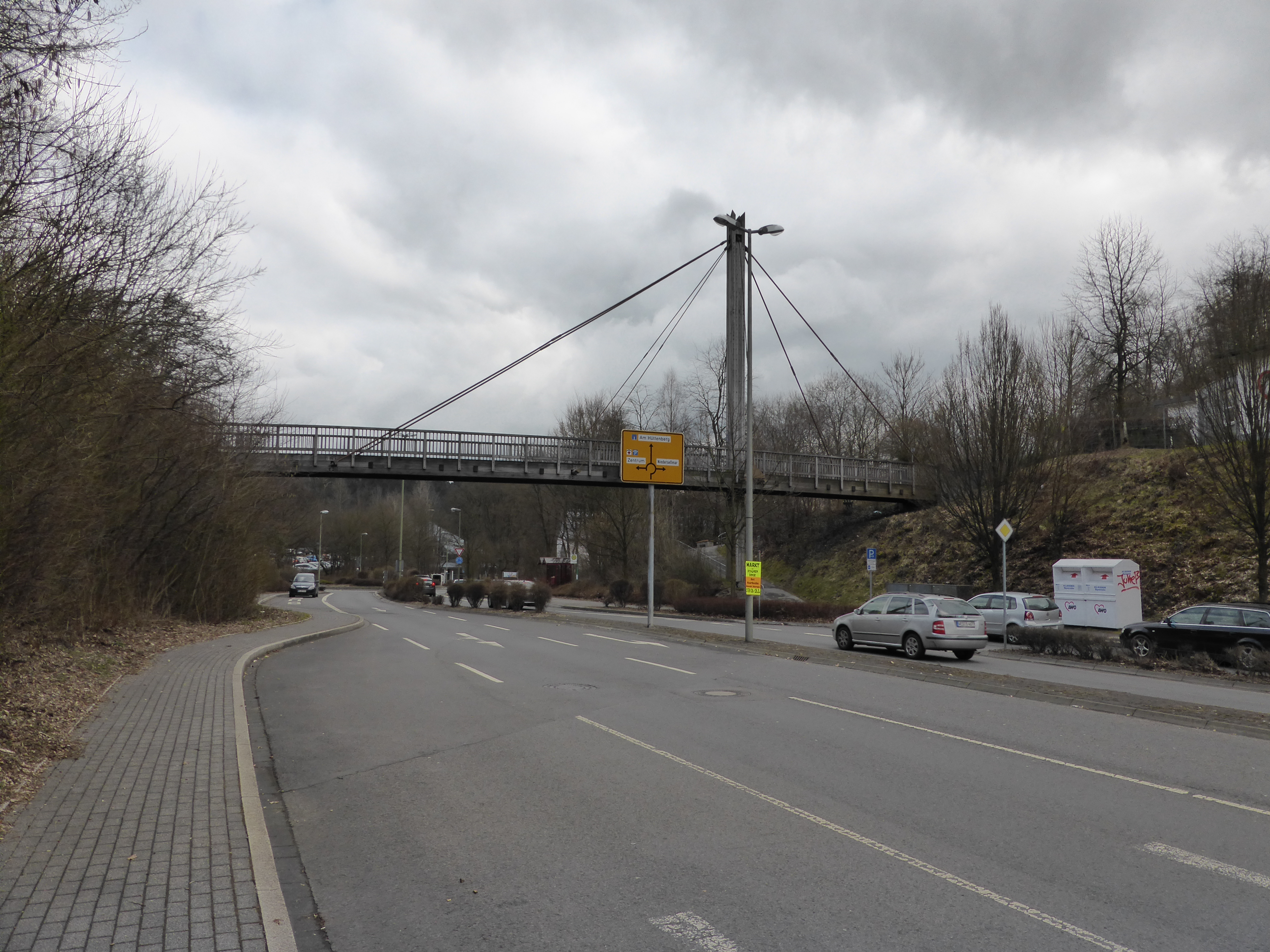 Die Fußgängerbrücke aus Bongossi-Holz überquert den Albert-Schweitzer-Platz und verbindet das Kreiskrankenhaus Gummersbach mit dem Wohngebiet auf der Berstig.