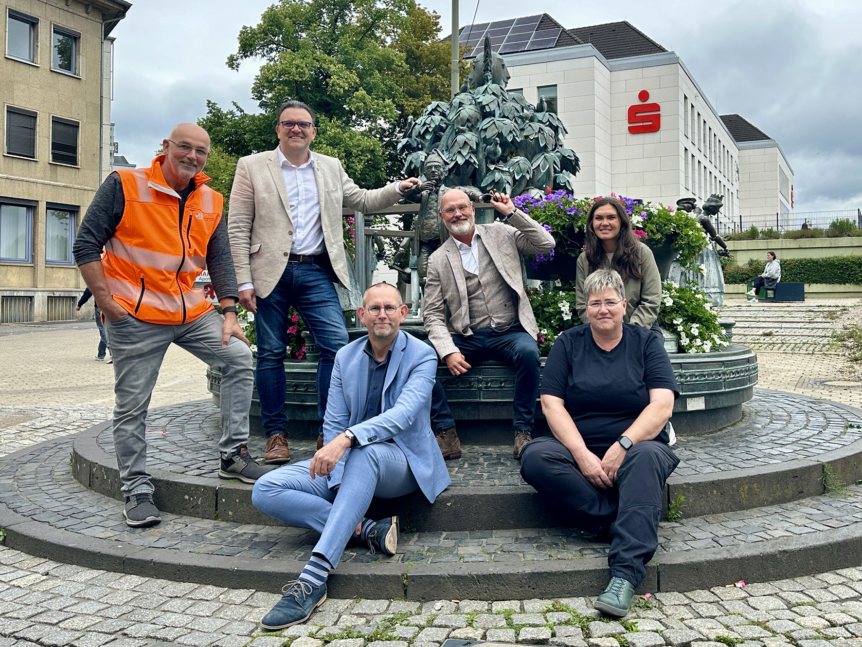 Christian Gernert (SIH), Michael Joithe (Bürgermeister), Thorsten Grote (Stadtbaurat), Michael Haupt (Sparkasse), Alexandra Herzfeld (Büro für Städtebauliche Projekte), Simone Walker (SIH) präsentieren den begrünten Brunnen.