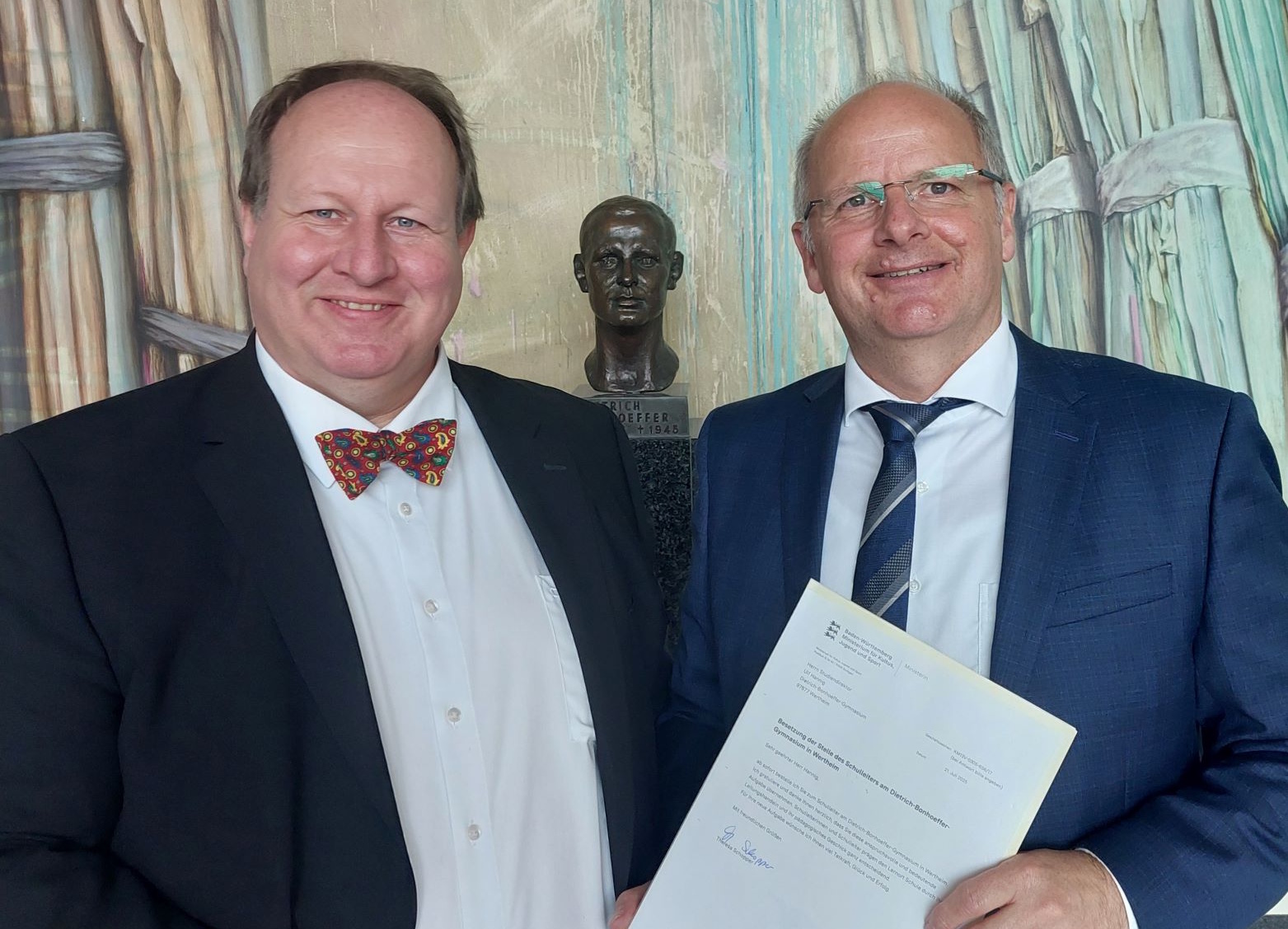 Jörg Brehmer, Schulreferent am Regierungspräsidium Stuttgart, überreicht Ulf Hannig das Bestellungsschreiben von Kultusministerin Theresa Schopper. Foto: DBG Wertheim