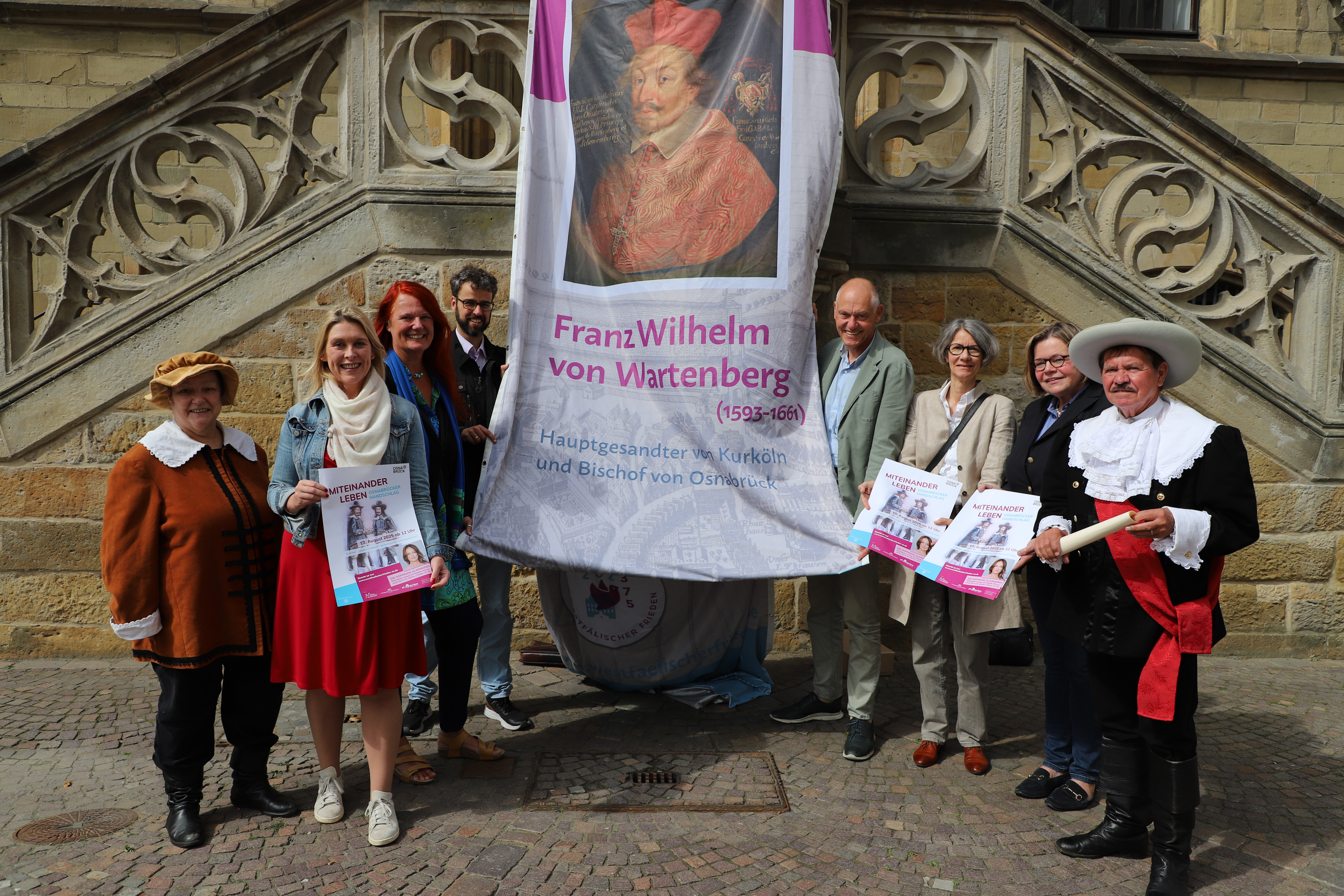Hilde Ehrenbrink von den Stadtspielern (links), Anke Bramlage (Leitung Projektbüro Kultur), Patricia Mersinger (Leitung Fachbereich Kultur), Dr. Jens Peters (Literaturbüro Westniedersachsen), Dr. Hermann Queckenstedt, (Direktor des Diözesanmuseums Osnabrück), Dr. Susanne Tauss (Geschäftsführerin Landschaftsverband Osnabrücker Land), Friederike Dauer Vorsitzende des Kirchenvorstands von St. Marien) und Stadtspieler Jürgen Wojcik.