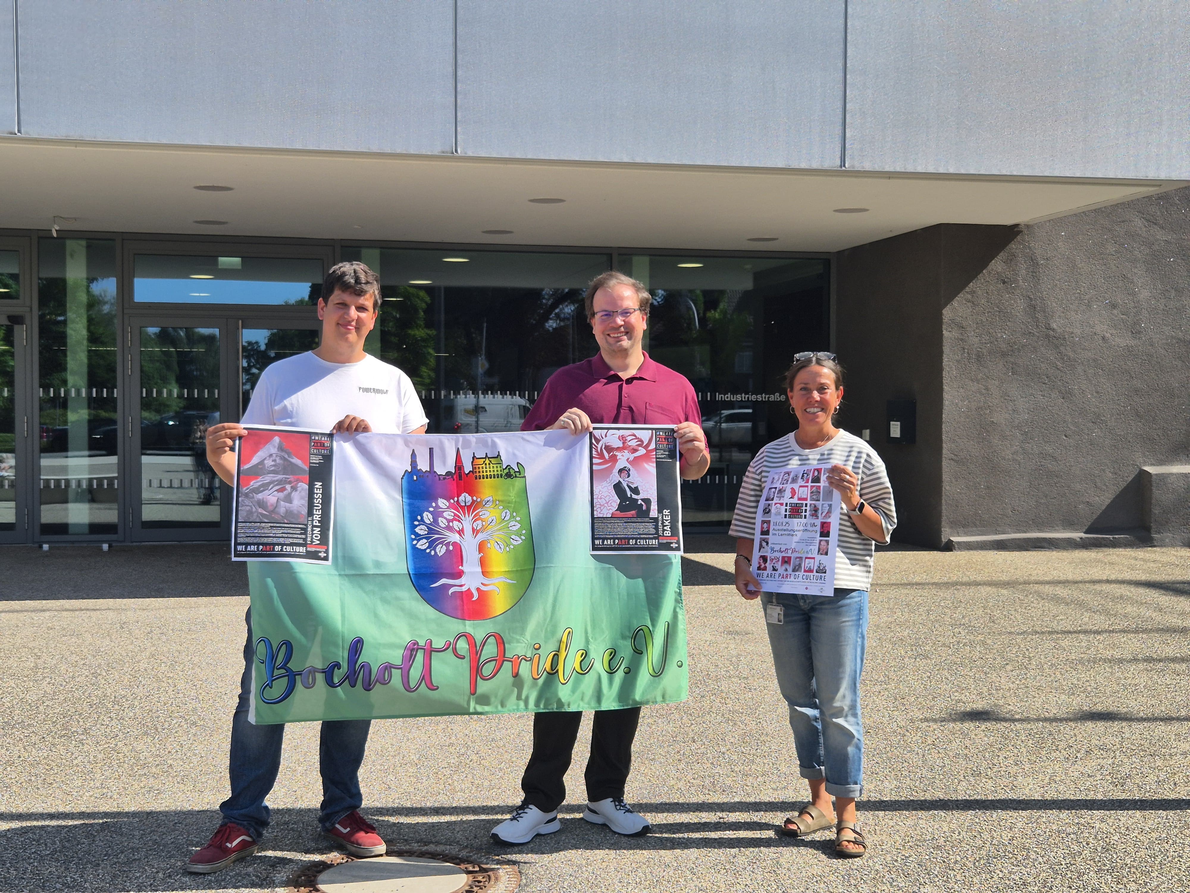 Christian Prast (von links) und Thorsten Jansen vom Verein Bocholt Pride gemeinsam mit Jule Wanders, Fachbereichsleiterin Kultur und Bildung der Stadt Bocholt
