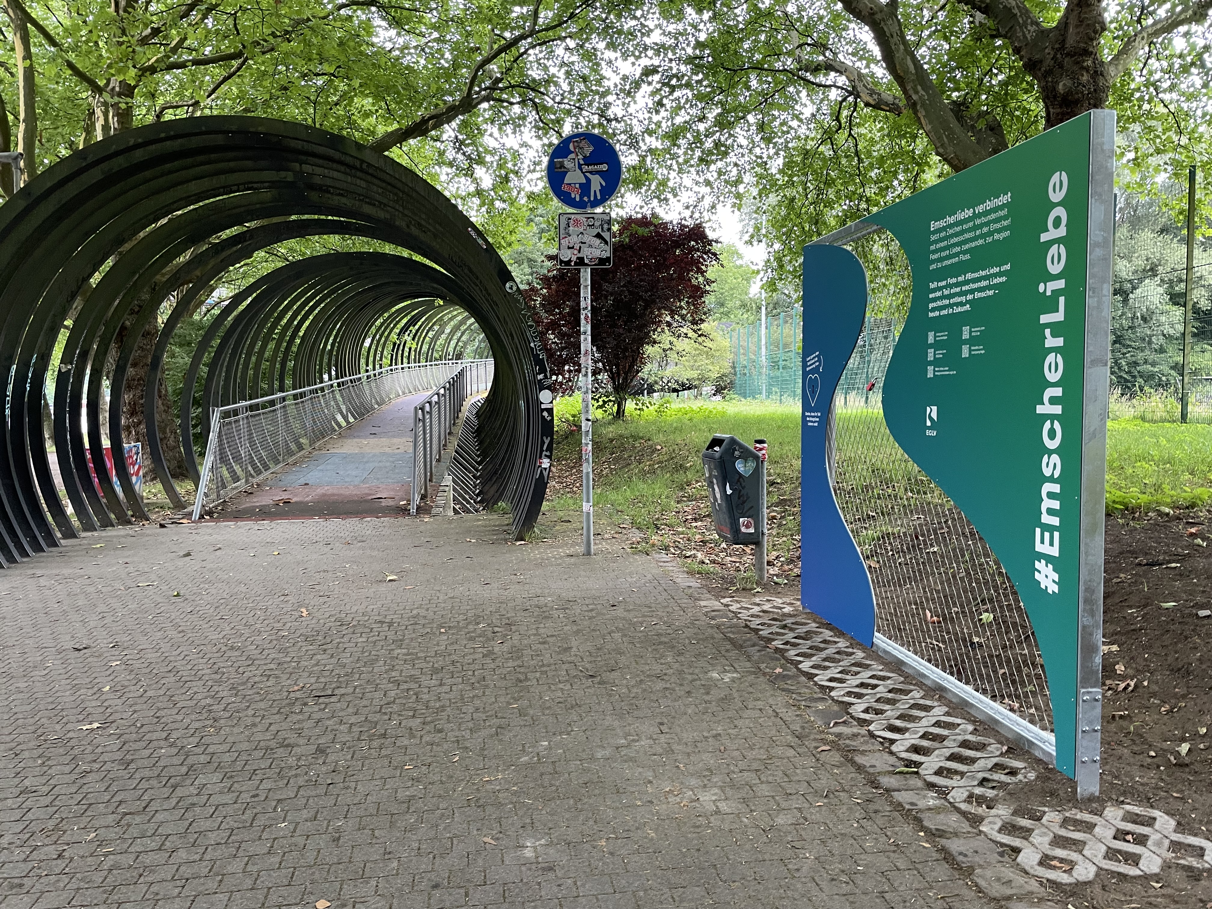 „Love is in the air“ an der Emscher: Das Anbringen von Liebesschlössern an die von Tobias Rehberger entworfene Brücke „Slinky Springs to Fame“ ist bekanntermaßen strikt verboten – verliebten Pärchen bietet die Emschergenossenschaft nun aber eine Alternative im Nahbereich der Brücke: Direkt am Aufgang zur Brücke auf der Emscher-Insel hat der Wasserwirtschaftsverband die Liebesschloss-Anlage „Emscher-Liebe“ installiert.