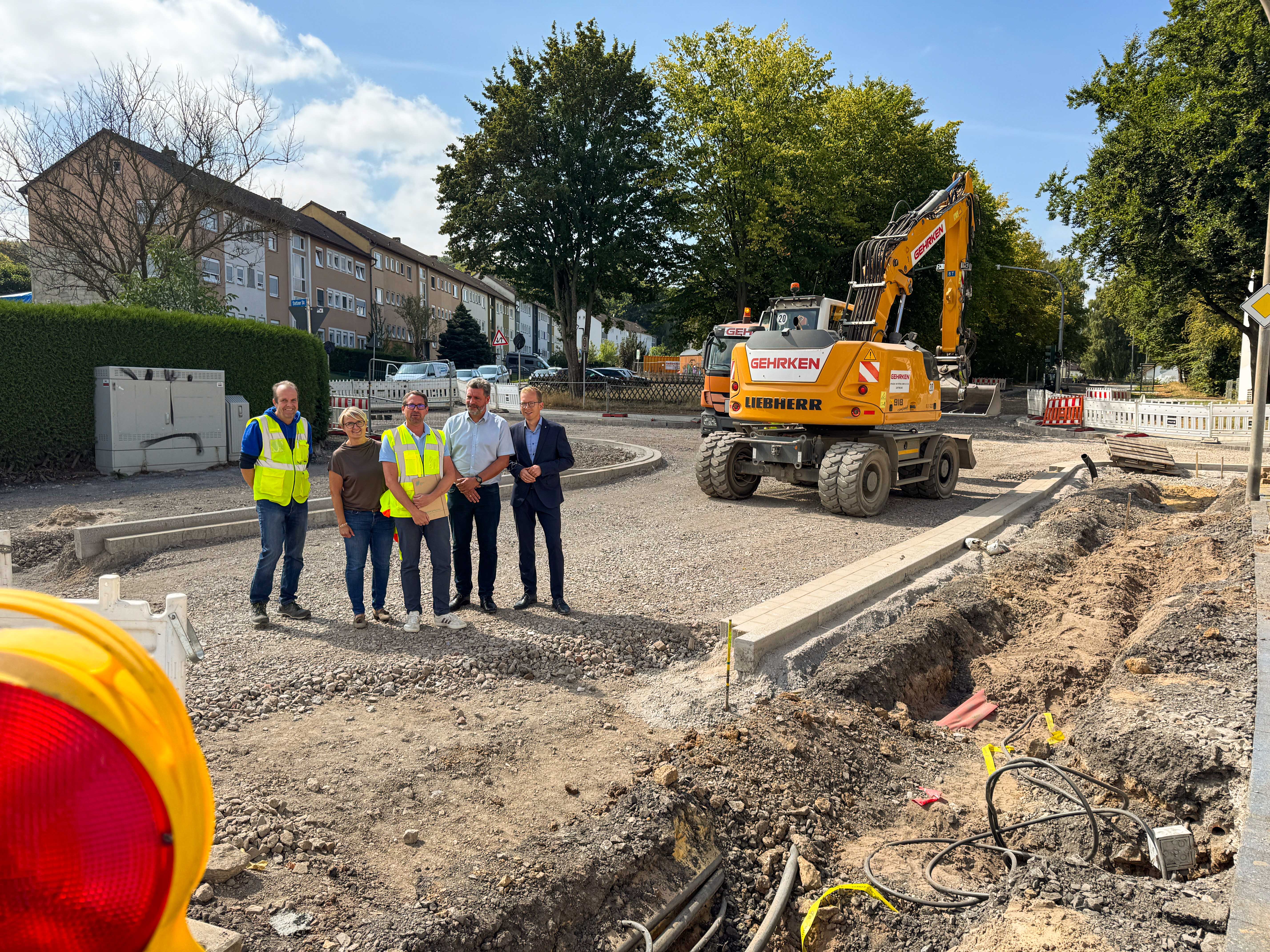 Bei der mehrjährigen Erneuerung der Zeppelinstraße und Pestalozzistraße gehen die Arbeiten sichtbar voran. Davon berichten (v.l.) Projektleiter Volker Block, Teamleiterin Straßenbau Beate Schmid, Tobias Fälker (Fachdienstleiter Verkehrsplanung und Straßenbau), Sven Köser (Fachbereichsleiter Bauen) und Bürgermeister Christian Schweitzer.