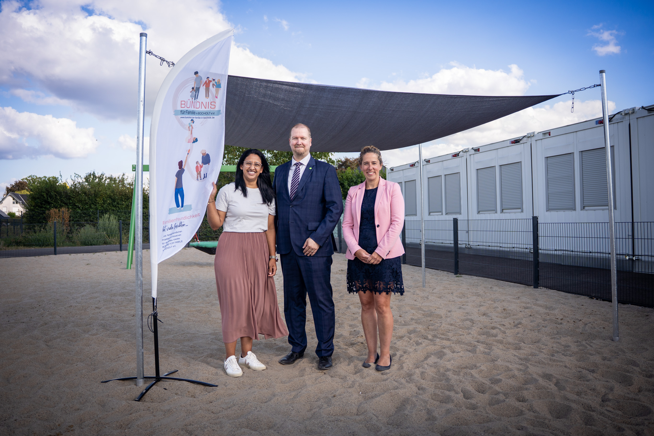 Gemeinsam stehen (von links) Sabahat Hameed, Vorsitzende des Bündnis für Familie in Bocholt, Erster Stadtrat Björn Volmering und Kämmerin Jennifer Schlaghecken unter dem neuen Sonnensegel am Takenkamp