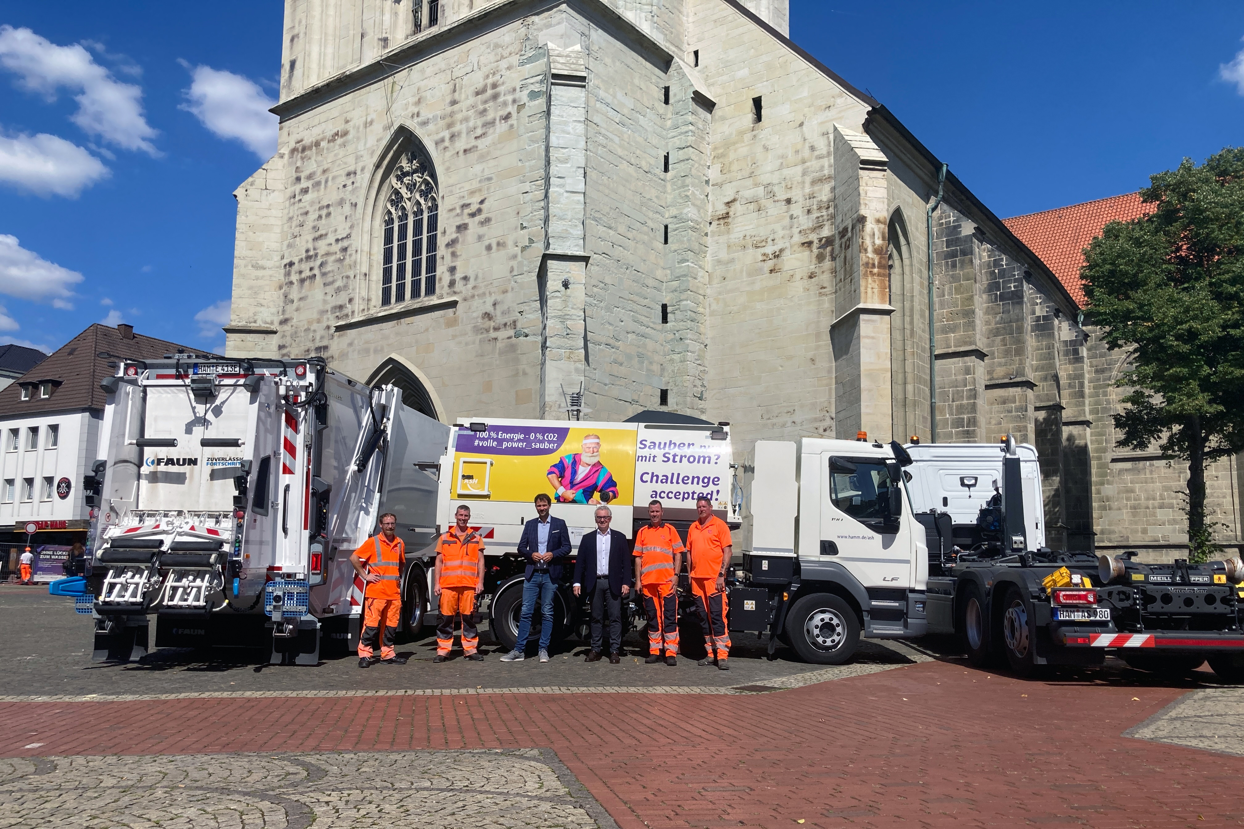 v.l.n.r.: Sebastian Bothe, Dennis Woboril (beide Müllabfuhr), Robert Reminghorst (Betriebsleiter des ASH), Volker Burgard (Dezernent für Klima, Umwelt und Migration), Ulrich Vormann (Straßenreinigung) und Sven Reisner (Wertstoffhof) stellen die drei neuen E-Fahrzeuge des ASH vor.