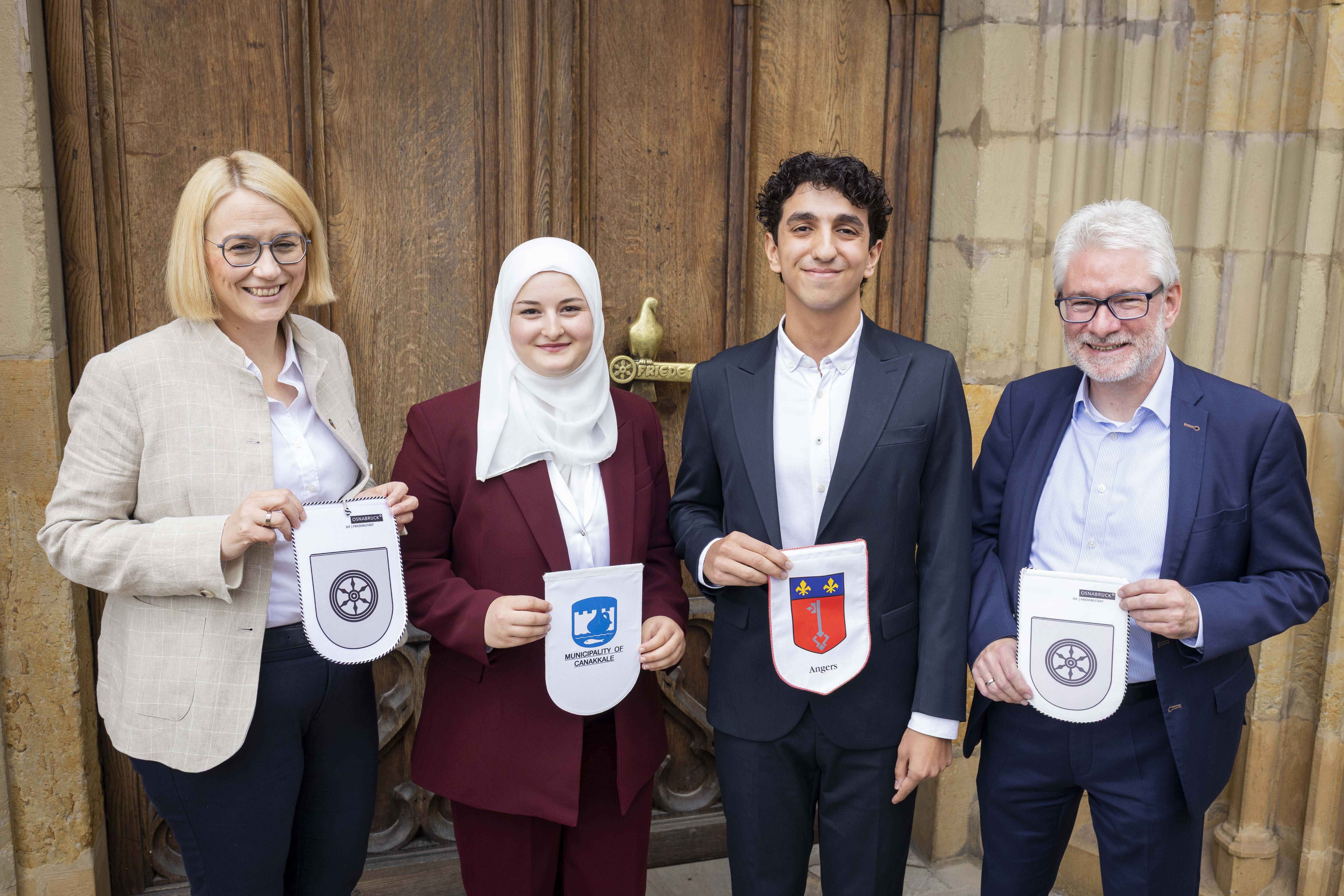 Oberbürgermeisterin Katharina Pötter (links) und Jens Koopmann (rechts), Leiter des Städtepartnerschaftsbüros verabschieden die beiden Städtebotschafter, die Osnabrück in zwei Partnerstädten vertreten. Huda Hamal Hadad (Zweite von links) geht nach Çanakkale, Sahin Ayhan reist nach Angers.
