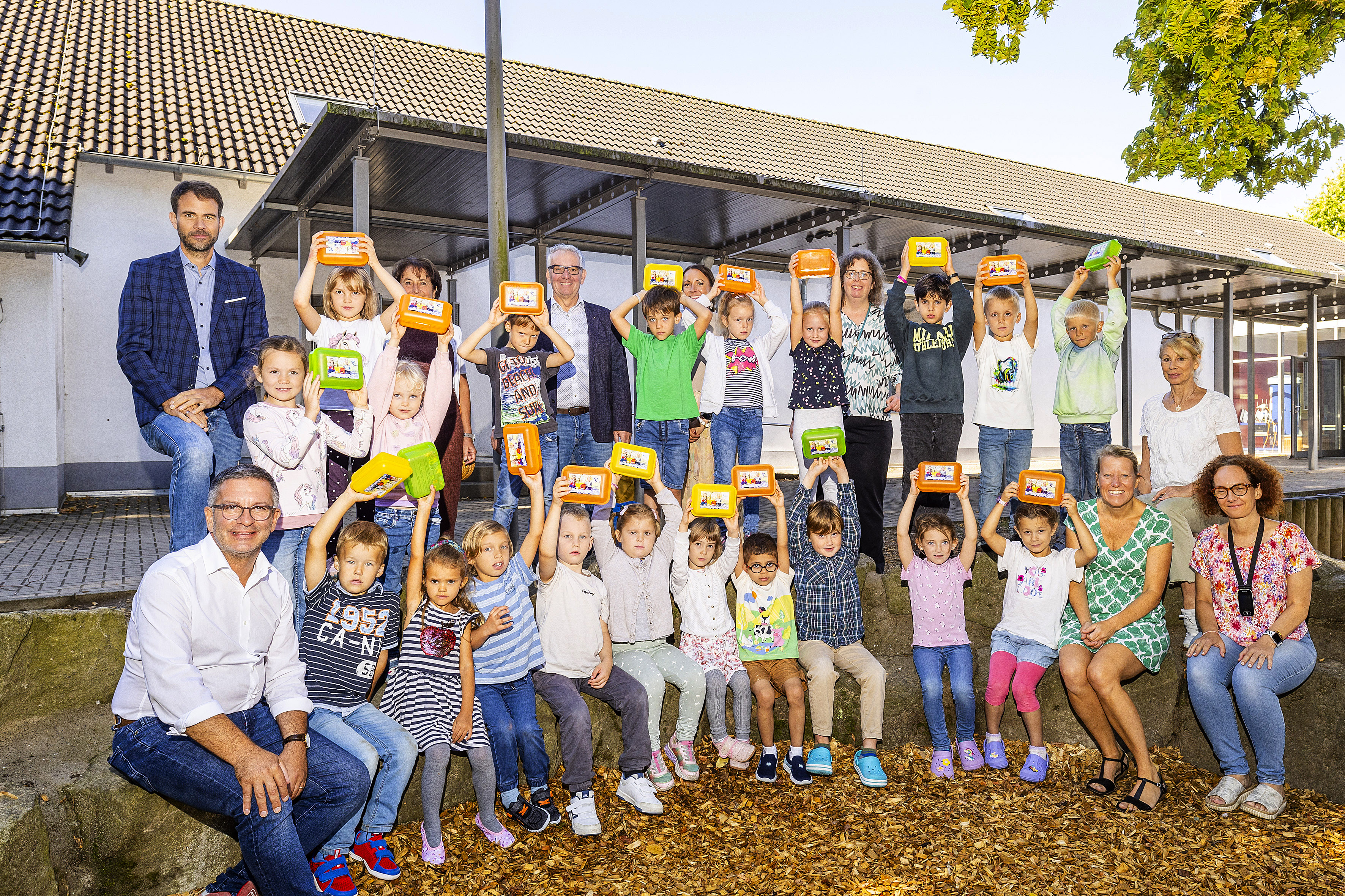 Oberbürgermeister Marc Herter, Umweltdezernent Volker Burgard, die Leiterin des Amts für schulische Bildung, Karin Diebäcker, und ASH-Betriebsleiter Robert Reminghorst verteilen die Brotdosen stellvertretend für alle Hammer Schulanfänger:innen, an die I-Dötzchen der Carl-Orff-Schule.