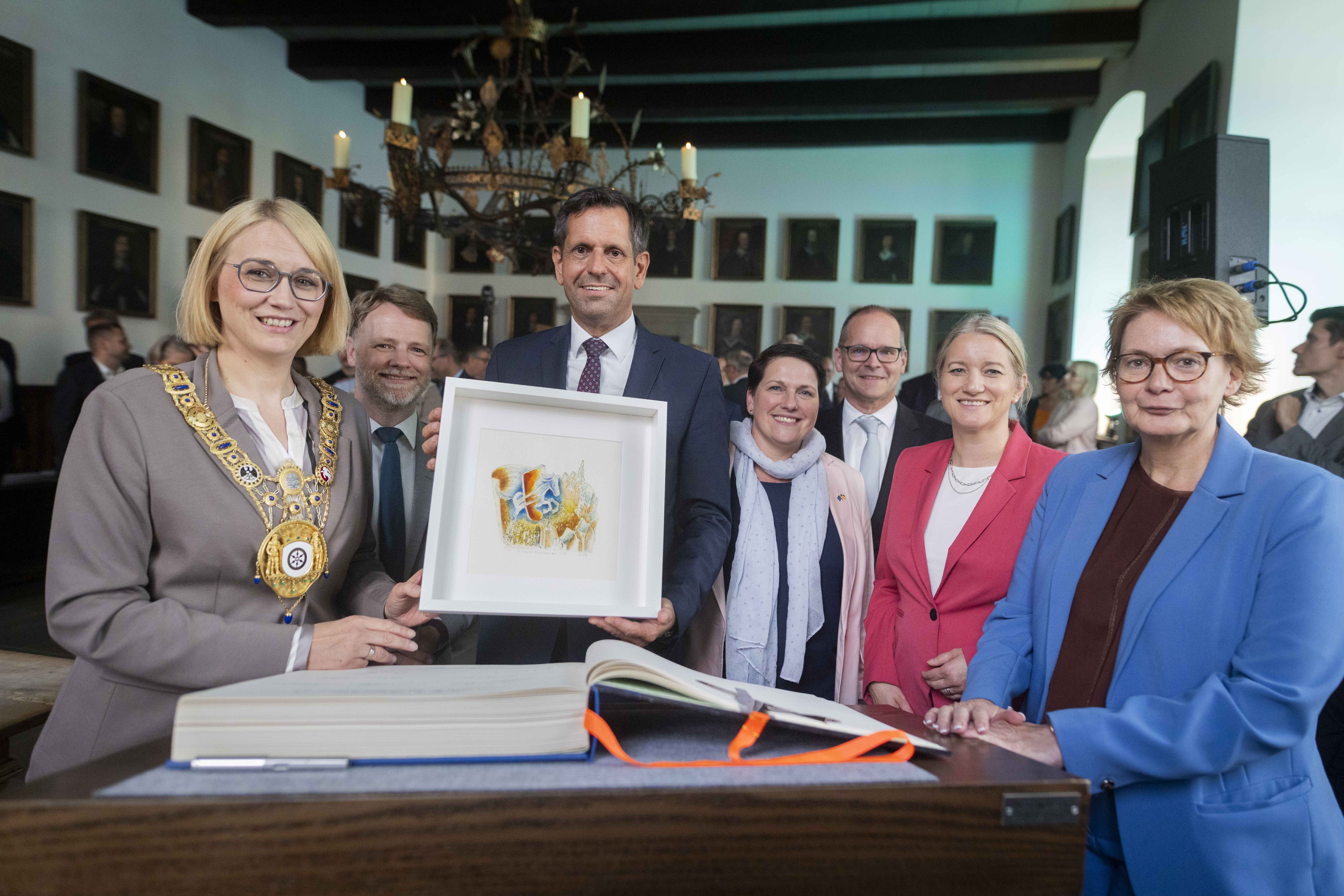 Oberbürgermeisterin Katharina Pötter (links) mit Finanzminister Gerald Heere, Ministerpräsident Olaf Lies, Europaministerin Melanie Walter, Wirtschaftsminister Grant Hendrik Tonne, Justizministerin Kathrin Wahlmann und Innenministerin Daniela Behrens.