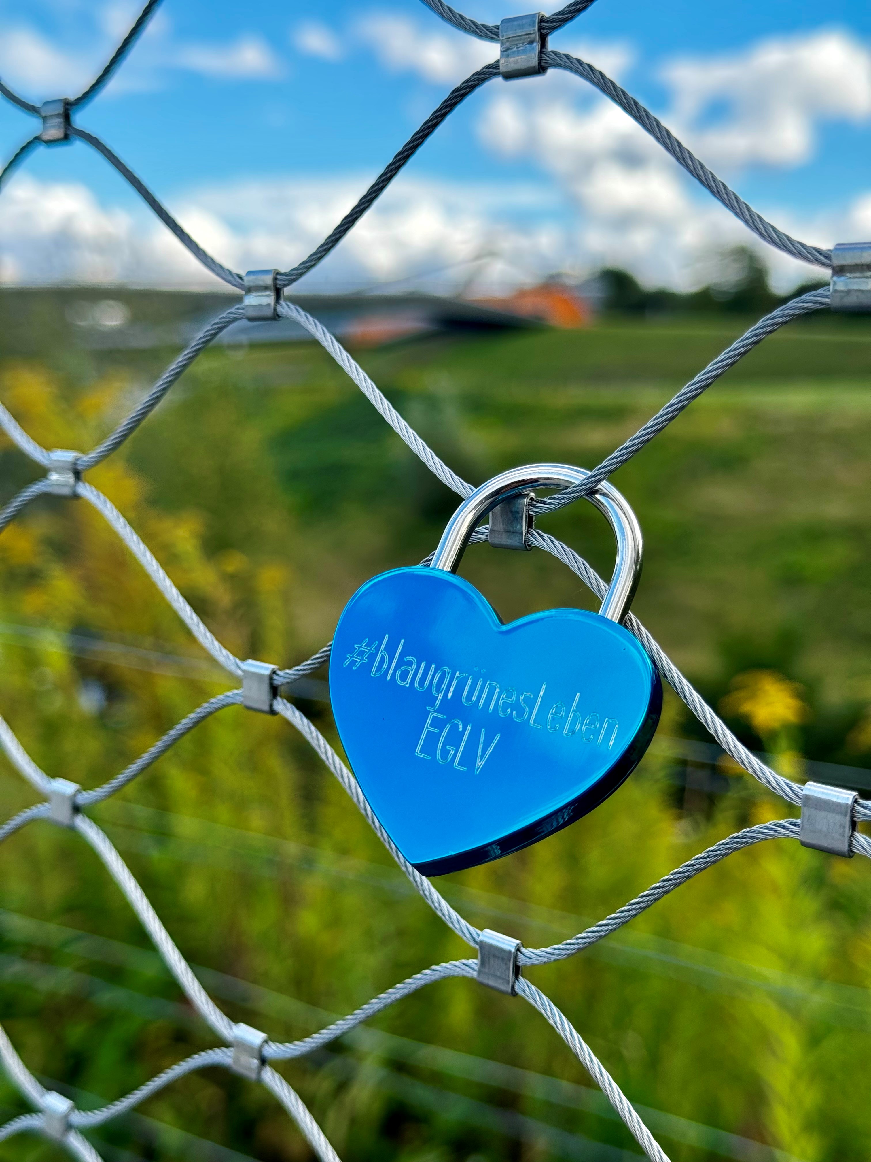 Blaugrünes Leben - dafür gibt es ein erstes Herzchen an der Liebesschlossanlage "Emscher-Liebe", die die Emschergenossenschaft am Aufgang zur Brücke "Sprung über die Emscher" in Castrop-Rauxel installiert hat.