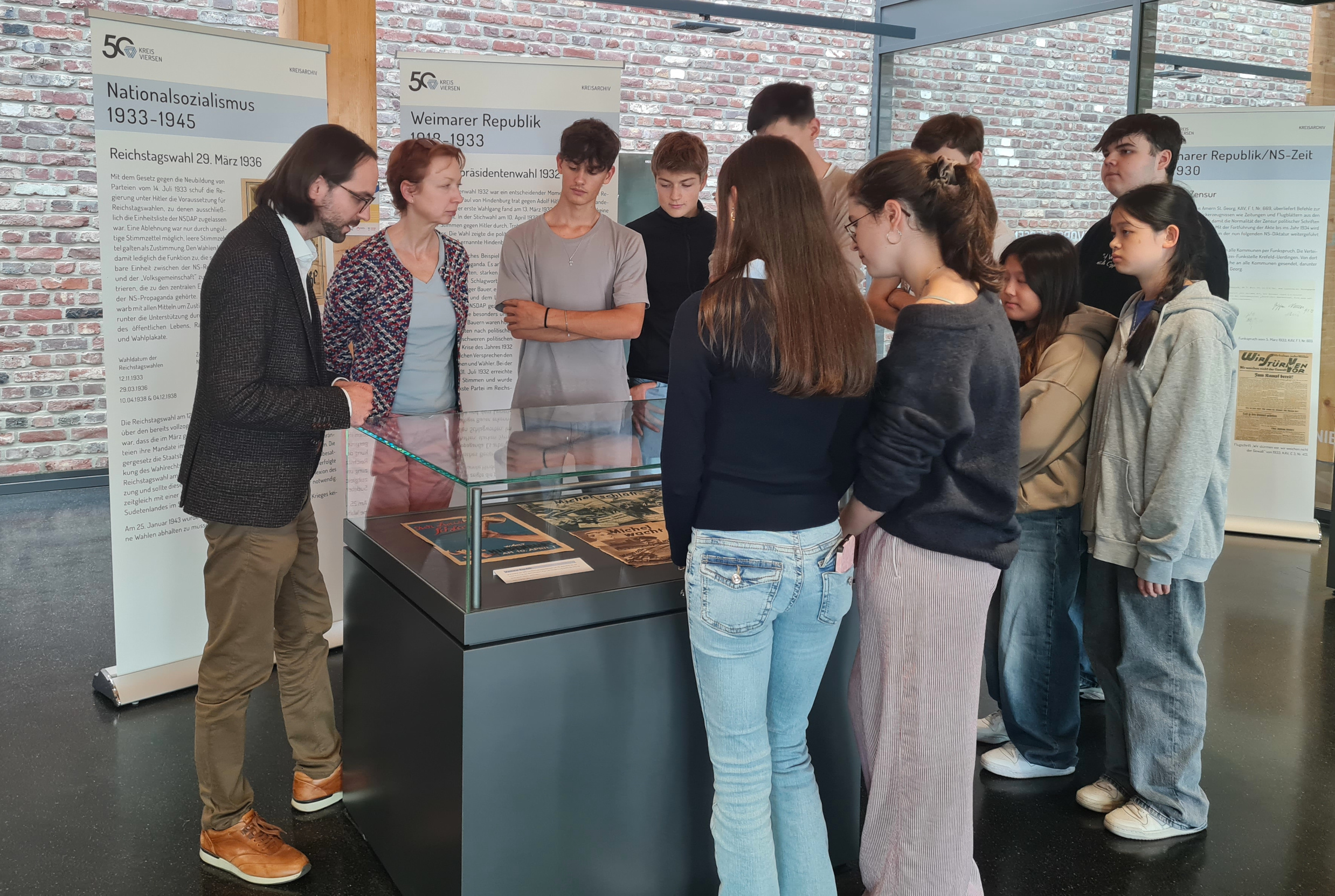 Dr. Matthias Herm (l.), stellvertretender Leiter des Kreisarchivs Viersen, und Annegret Hols (2.v.l.), Archivarin, haben die Schülerinnen und Schüler im Kreisarchiv Viersen begrüßt