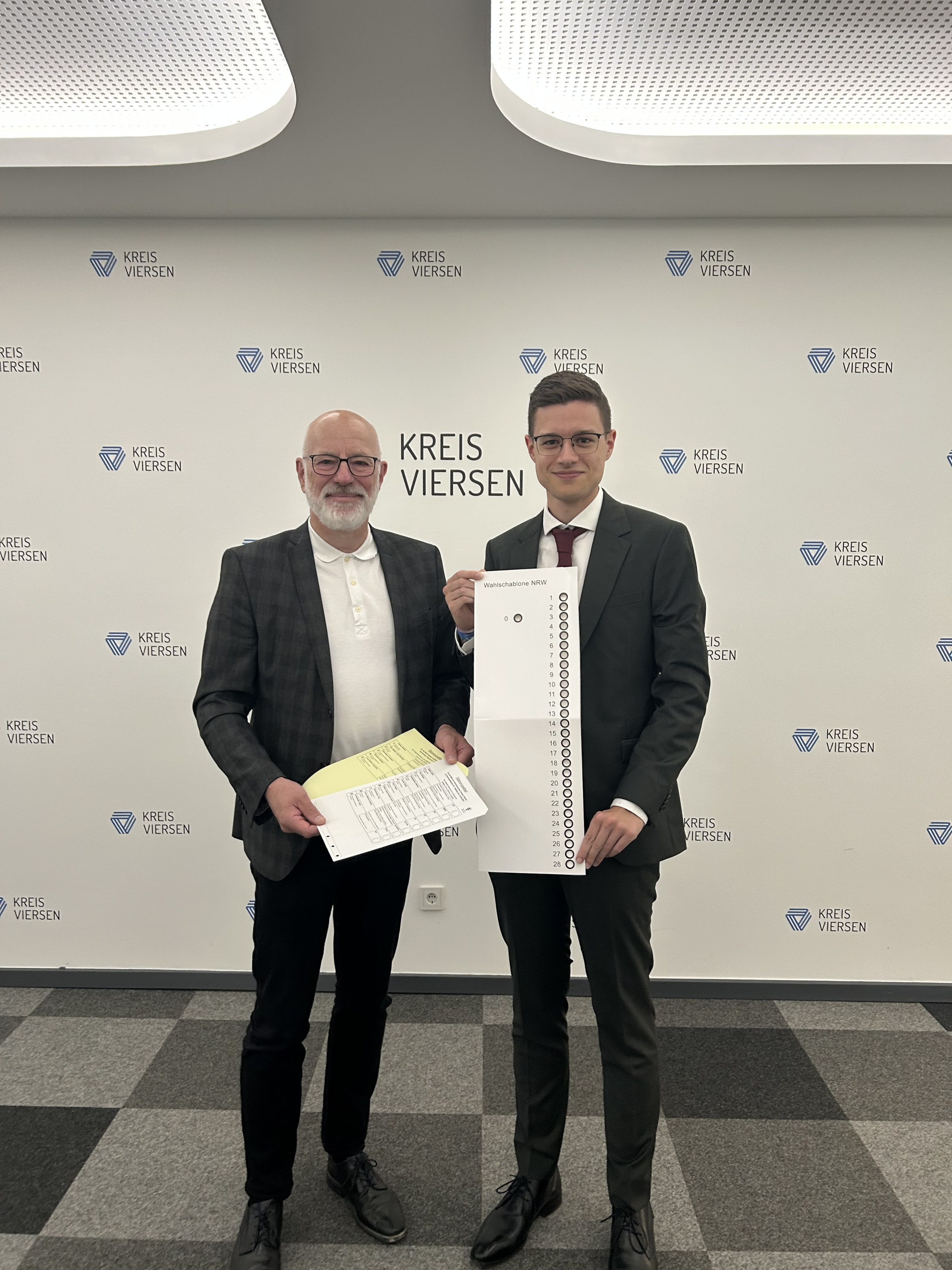 Kreiswahlleiter Ingo Schabrich und Tobias Tackenberg, zuständig für Kommunalaufsicht im Kreis Viersen, zeigen die Wahlzettel und die Wahlschablone.
