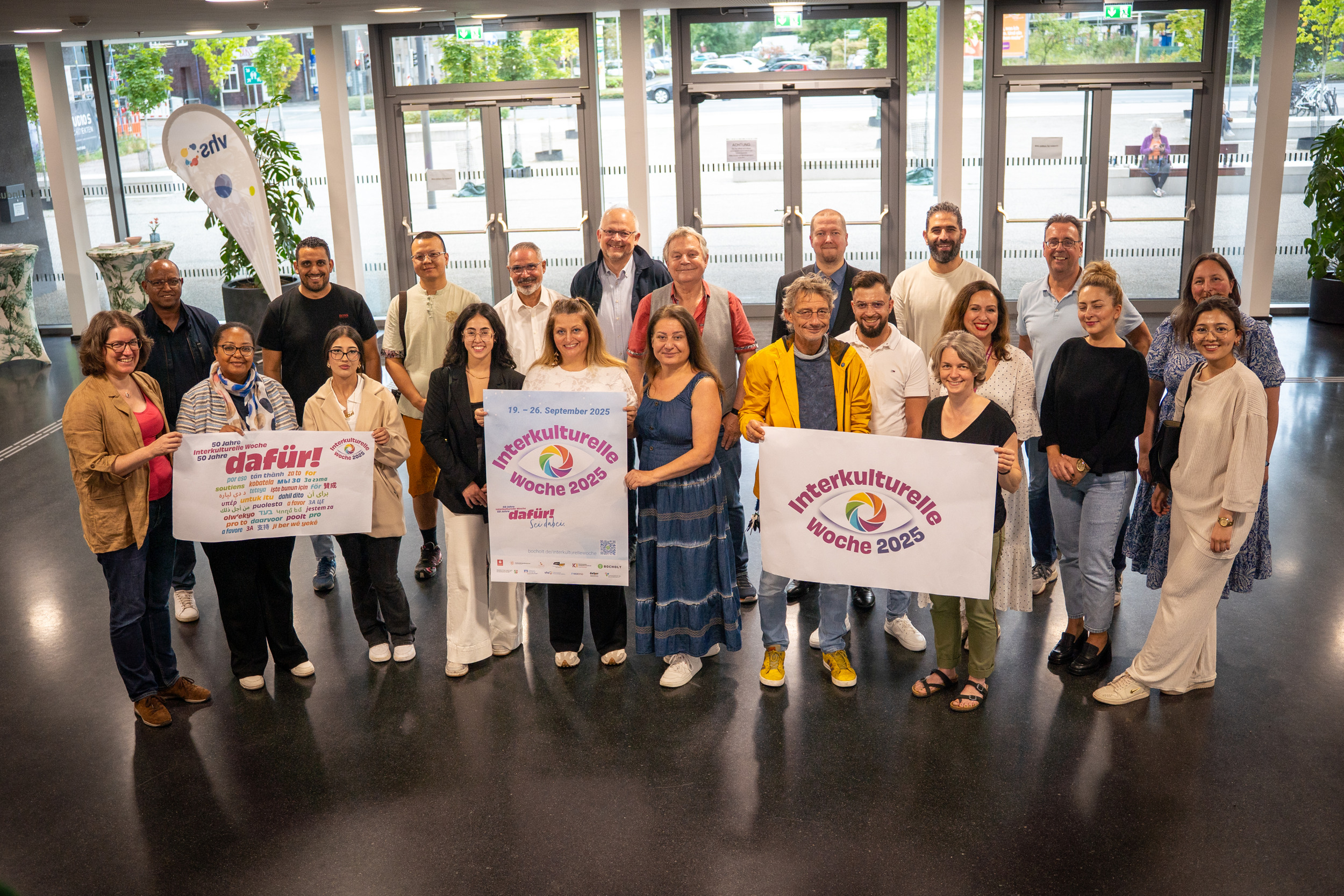 Das Orgateam mit einem Teil der Vertreter der beteiligten Vereine und Organisationen freut sich auf eine tolle Interkulturelle Woche 2025 unter dem Motto "DAFÜR!"