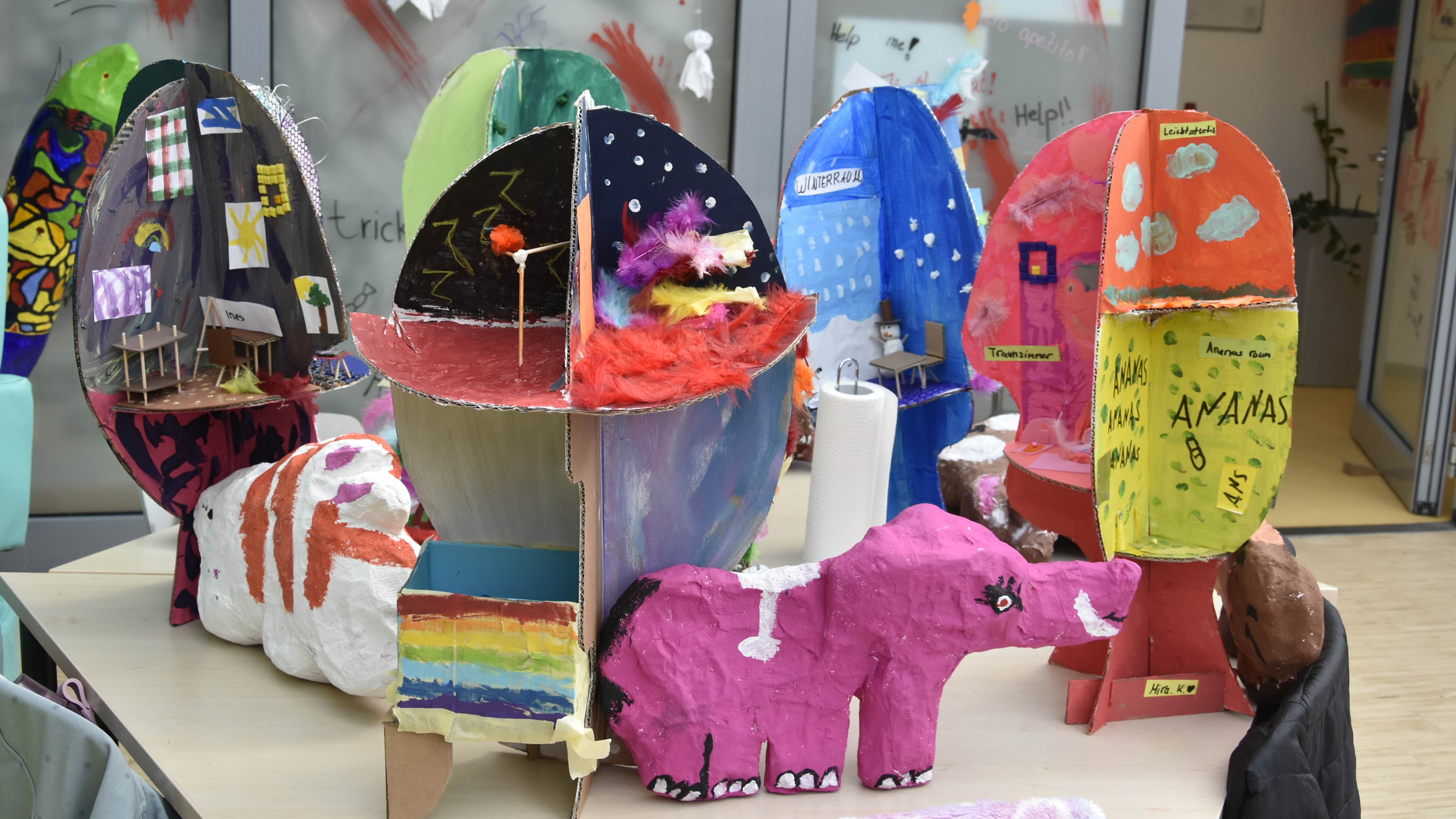 Bei der Herbstakademie „Kunst hoch fünf“ in der CreativWerkstatt in Herten entstehen echte Kunstwerke – wie diese aus dem vergangenen Jahr. Die jungen Teilnehmenden hatten Köpfe gestaltet, in denen verschiedene Räume abgebildet wurden. Diese Räume repräsentieren die verschiedenen Hobbys und Eigenschaften der Kinder und Jugendlichen. (Foto: Mia Hintze_Stadt Herten)
