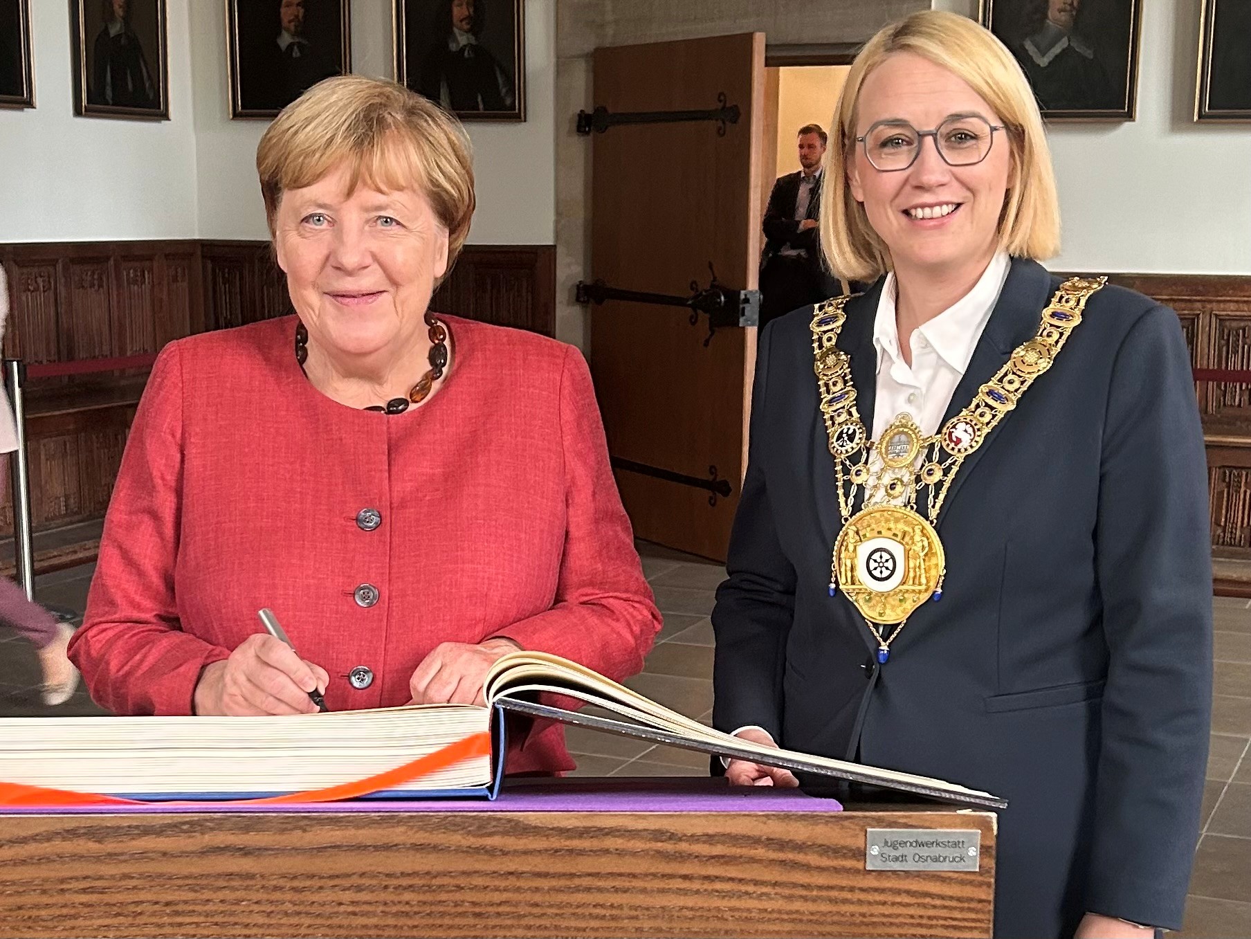 Die ehemalige Kanzlerin Angela Merkel (links) trägt sich in das Goldene Buch der Stadt Osnabrück ein. Oberbürgermeisterin Katharina Pötter hatte sie um ihren insgesamt vierten Eintrag gebeten.