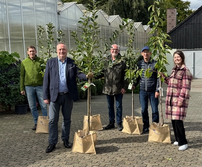 Landrat Bodo Klimpel (2.v.l.), Kreisgarten-Leiter Martin Brauckmann (li.) sowie Reinhard Schöer, Götz Fischer und Lisa Ellenberger vom Umweltamt des Kreises Recklinghausen freuen sich darauf, den Babys des Jahres 2025 ein Obstbäumchen überreichen zu können.